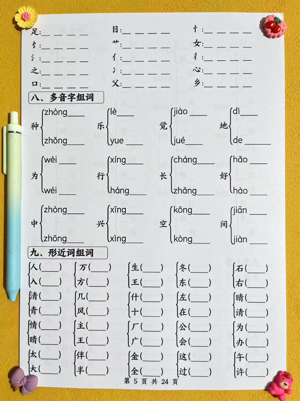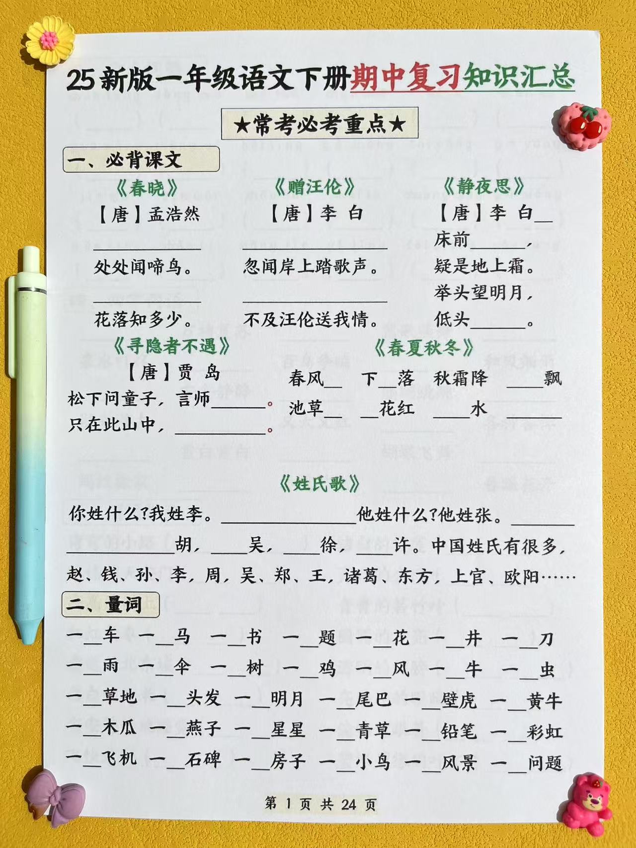 期中考试倒计时,一年级语文复习如何高效避坑?面对古诗默写提笔忘字、量词搭配张冠李戴、形近字频频混淆三大难关,这份《语文期中速记指南》,从核心考点归类、趣味记忆法、高频易错题解析切入,让孩子轻松攻克重难点!