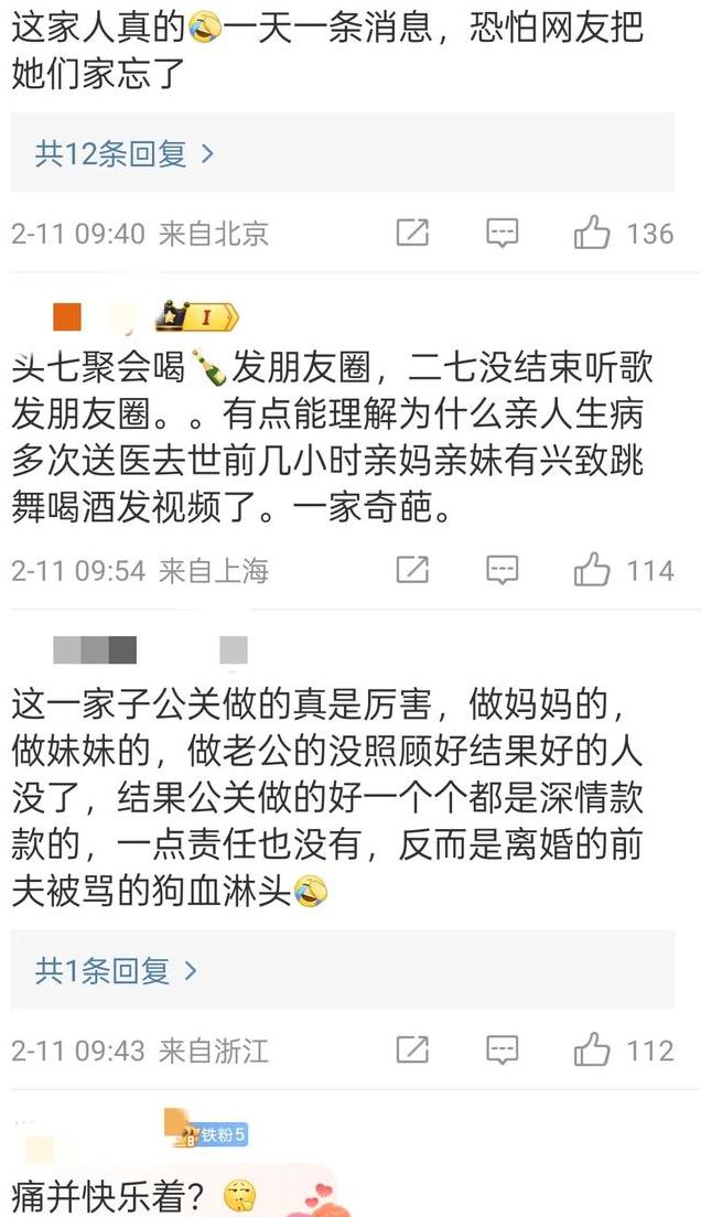 头七聚会喝酒发朋友圈,二七没结束听歌发朋友圈,有点能理解为什么亲人生病多次送医去世前几小时亲妈亲妹有兴致跳舞喝酒发视频了,一家奇葩。