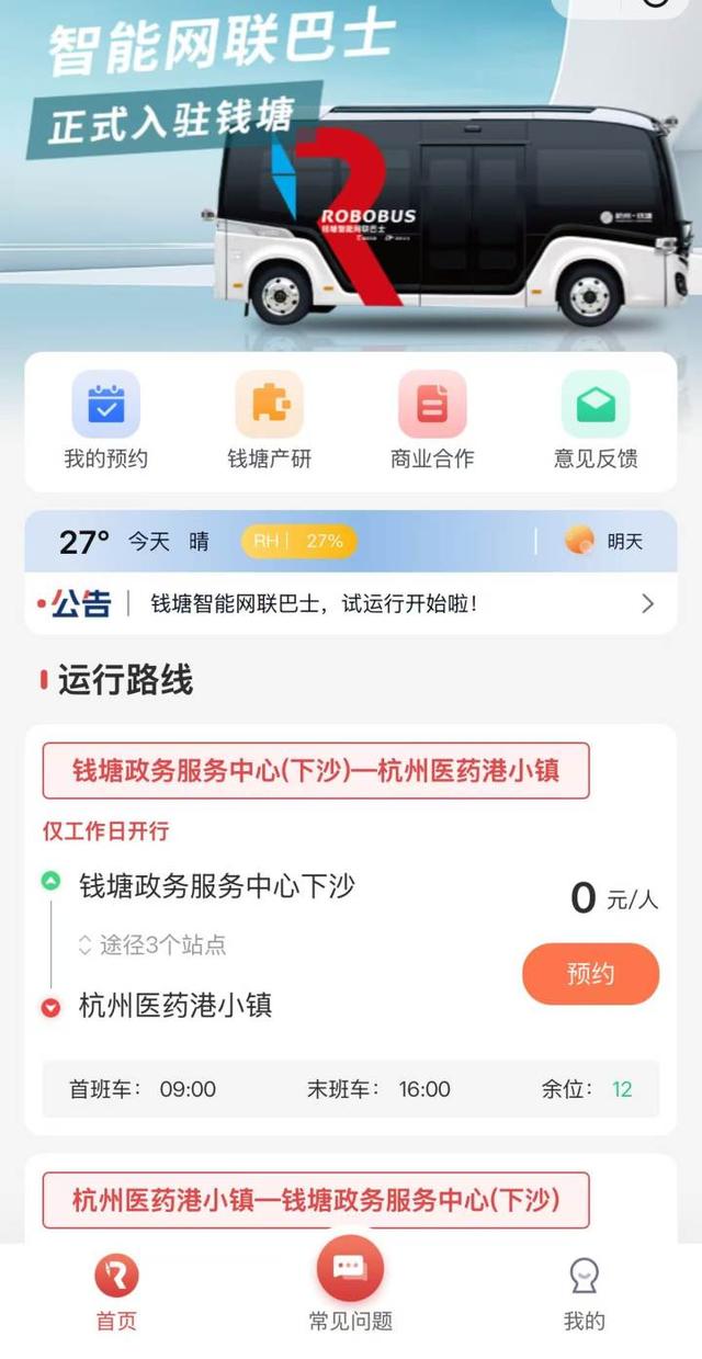 扫描站台上的二维码,会跳出自动驾驶公交的预约界面,目前自动驾驶公交可以免费乘坐,完成预约后就可以上车扫码验票,等待发车,间隔半小时左右会发一班车。