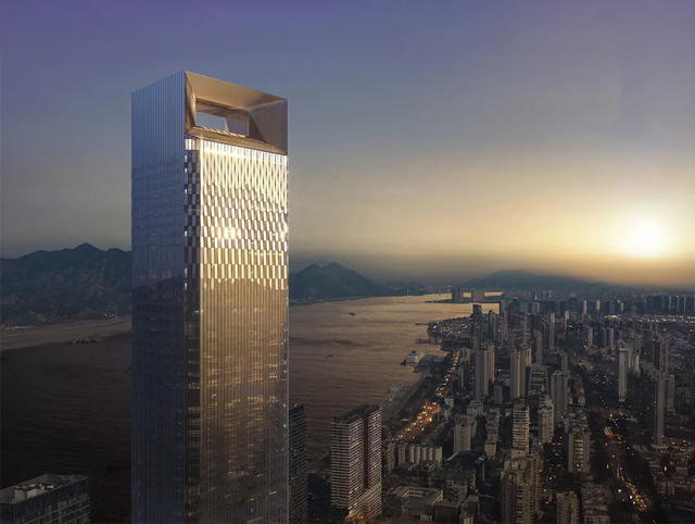 顶部35米高的“门”形塔冠向江面悬挑,既呼应温州江心屿双塔的历史画面,也象征着温州开放包容的城市气质。