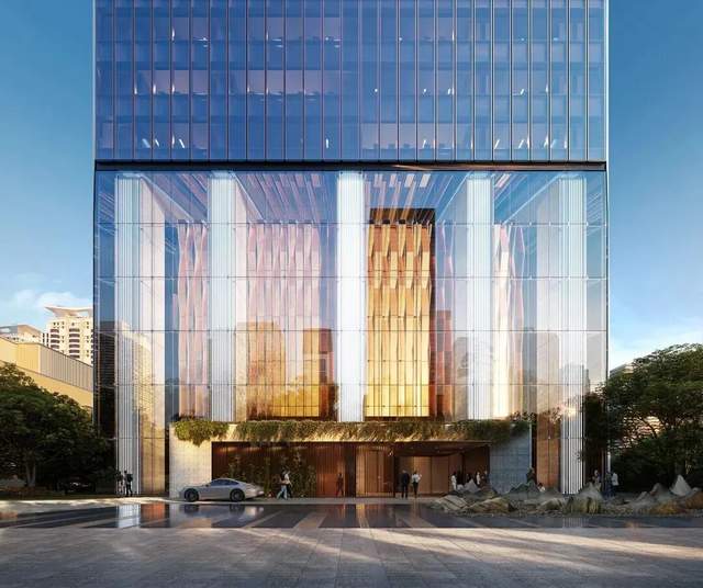 建筑立面采用动态光影设计,南北立面从底部玻璃向上渐变为编织纹理金属幕墙,仿佛捕捉了江面的粼粼波光,纹理灵感也源自温州非遗灯笼工艺;东西立面则以竖向金属遮阳肋强化挺拔感,兼具美学与节能功能。