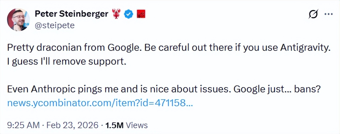 相关限制措施引发了 OpenClaw 创始人 Peter Steinberger 的强烈不满,他马上吐槽谷歌这种“没有警告,也没有补救措施”的做法太严苛了,更是直言“看来我得停止对谷歌的支持了。”