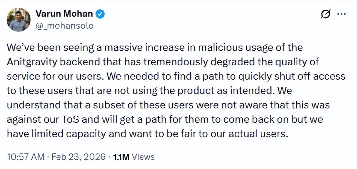 谷歌 DeepMind 工程总监 Varun Mohan 迅速在社交媒体上做出解释:“我们发现恶意使用 Antigravity 后端的情况激增,严重影响了用户的服务质量。我们需要尽快找到一种方法,切断这些未按预期使用产品用户的访问权限。我们理解部分用户并不了解这种行为违反了我们的服务条款,我们会为他们提供恢复访问权限的途径,但由于资源有限,我们希望公平对待所有正常用户。”