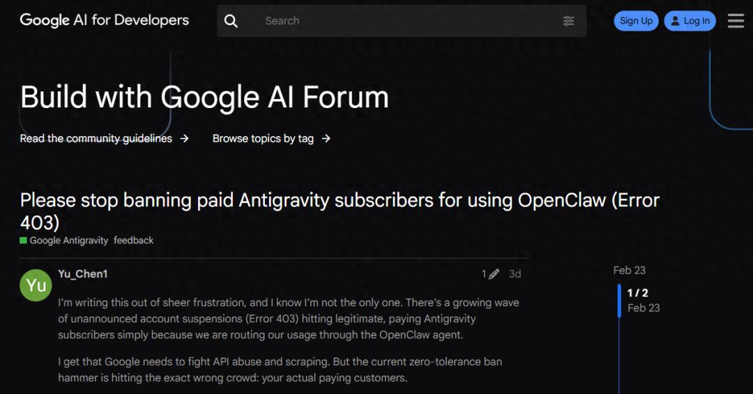 就在几天前,谷歌限制了部分开发者通过 OpenClaw 调用 Antigravity 平台后端服务的账户访问权限,理由是认为其“恶意使用”。