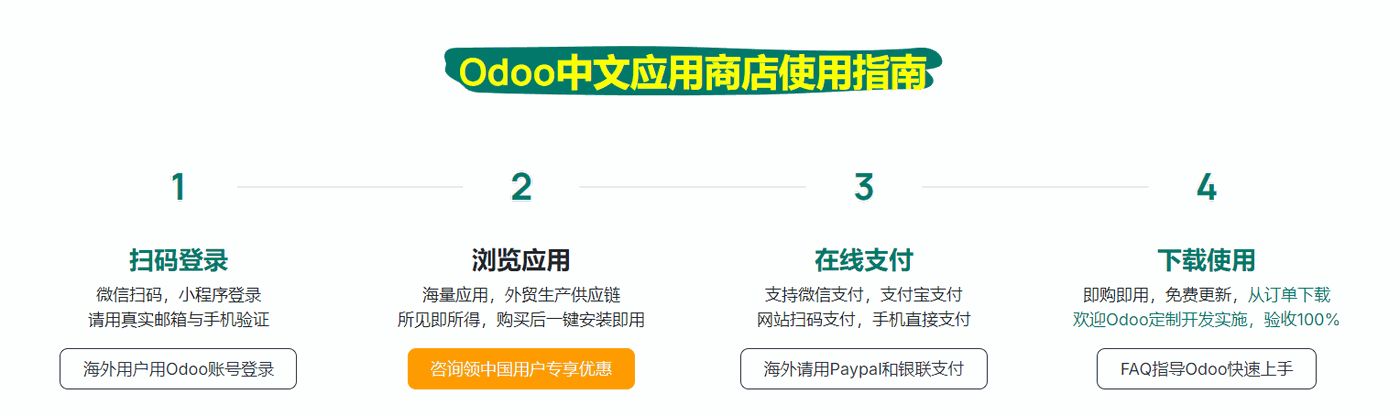 2. 应用模块是成熟产品,请仔细阅读相关说明,我们不提供即时消息的支持,不提供电话支持,仅提供邮件支持。相关支持级别与 Odoo官网的第三方应用政策使用同等标准。