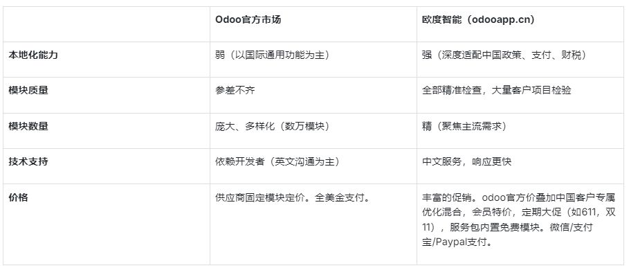 在此生态下,欧度智能在 odoo官方市场提供了大量免费模块,同时也搭建了中国专属的odoo中文应用市场,一个针对中国本土化需求定制的Odoo模块平台,其定位与官方应用市场形成差异化,主要服务于中国企业用户,是中国企业落地Odoo的实用跳板,其核心价值在于“本土化能力”和“服务闭环”,显著降低了Odoo在中国市场的使用门槛。尤其适用于“中国企业,需快速实现财税合规、本土支付、社保计算等刚性需求;希望减少语言障碍和技术沟通成本,优先选择中文服务的企业;对行业标准化解决方案(如零售、制造)有明确需求的用户。