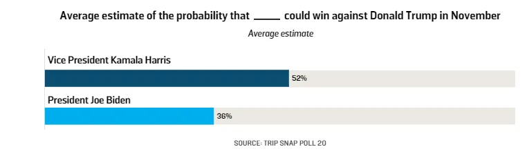 国际关系专家——在同一周接受调查——持不同看法。TRIP调查要求受访者估计如果哈里斯取代拜登成为民主党候选人,她在11月击败特朗普的概率,以及如果拜登与特朗普对决时获胜的概率。受访政治学家的平均估计是,哈里斯获胜的概率为52%,而拜登仅为36%。