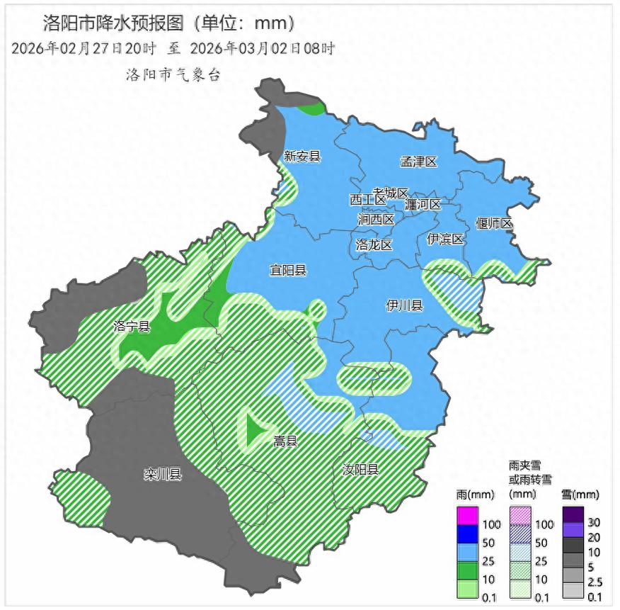受冷空气和暖湿气流共同影响,预计2月27日夜里至3月1日,全市有小到中雨,其中西南部部分县小到中雨转雨夹雪或小雪,高海拔山区雨夹雪转中到大雪,局部暴雪。