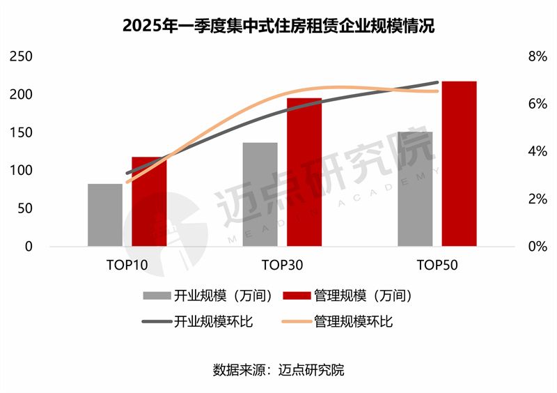 开业规模总量:截至2025年一季度,TOP50住房租赁企业合计开业规模达151.28万间,环比增长6.9%;TOP30住房租赁企业合计开业规模136.95万间,环比增长5.7%,占榜单所有企业开业规模的90.5%,入榜门槛约1.44万间;TOP10住房租赁企业合计开业规模82.64万间,环比增长3.1%,占榜单所有企业开业规模的54.6%,入榜门槛约4.28万间。