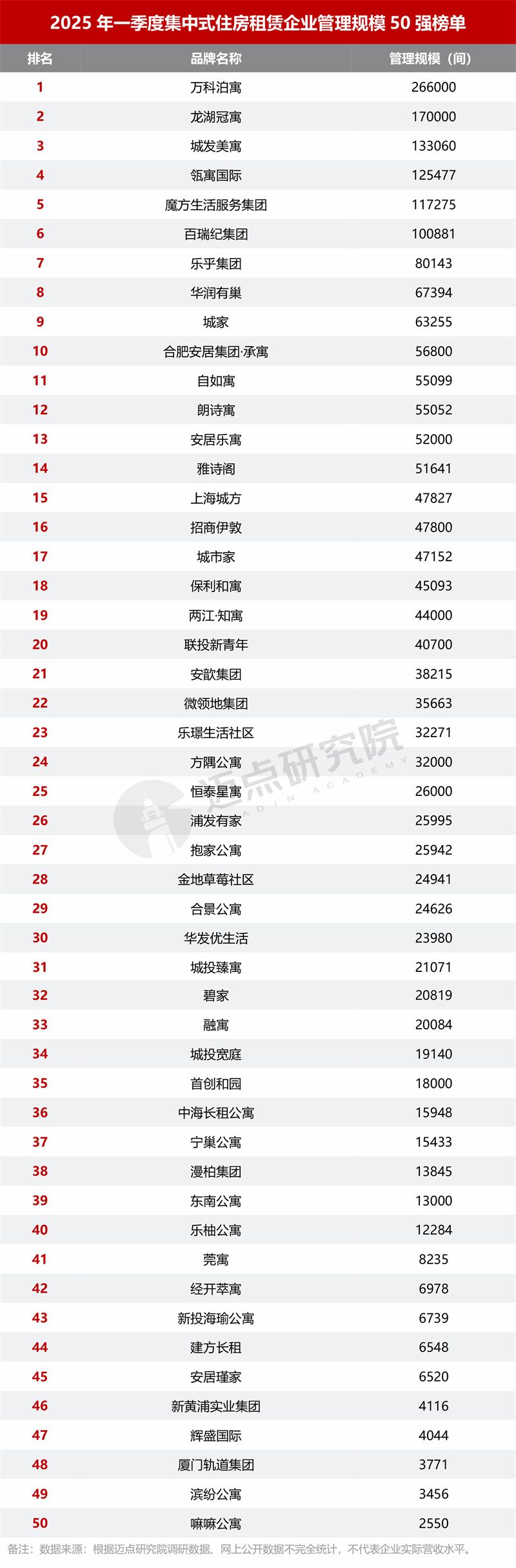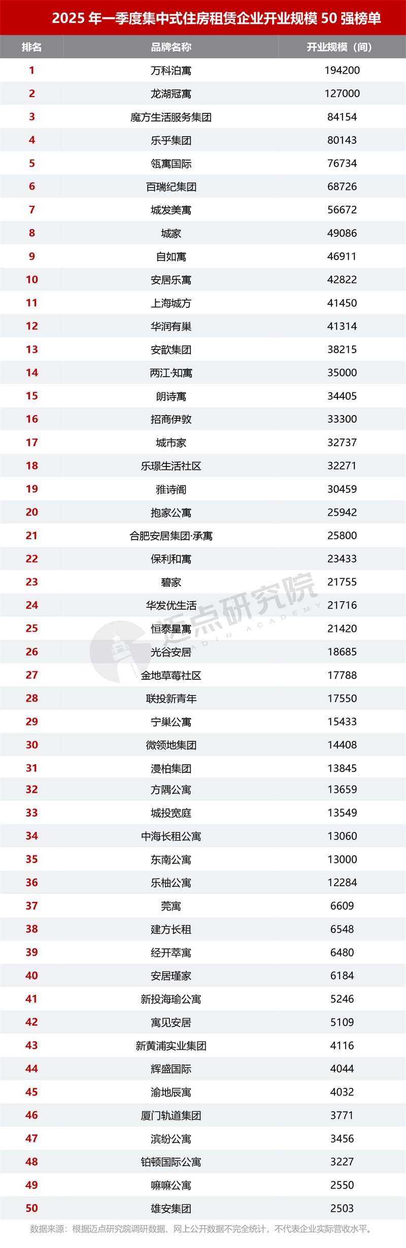 以下是迈点研究院最新发布的“2025年一季度集中式住房租赁企业开业规模TOP50”、“2025年一季度集中式住房租赁企业管理规模TOP50”。其中,万科泊寓、龙湖冠寓和魔方生活服务集团位居开业规模榜前三;万科泊寓、龙湖冠寓和城发美寓位居管理规模榜前三。