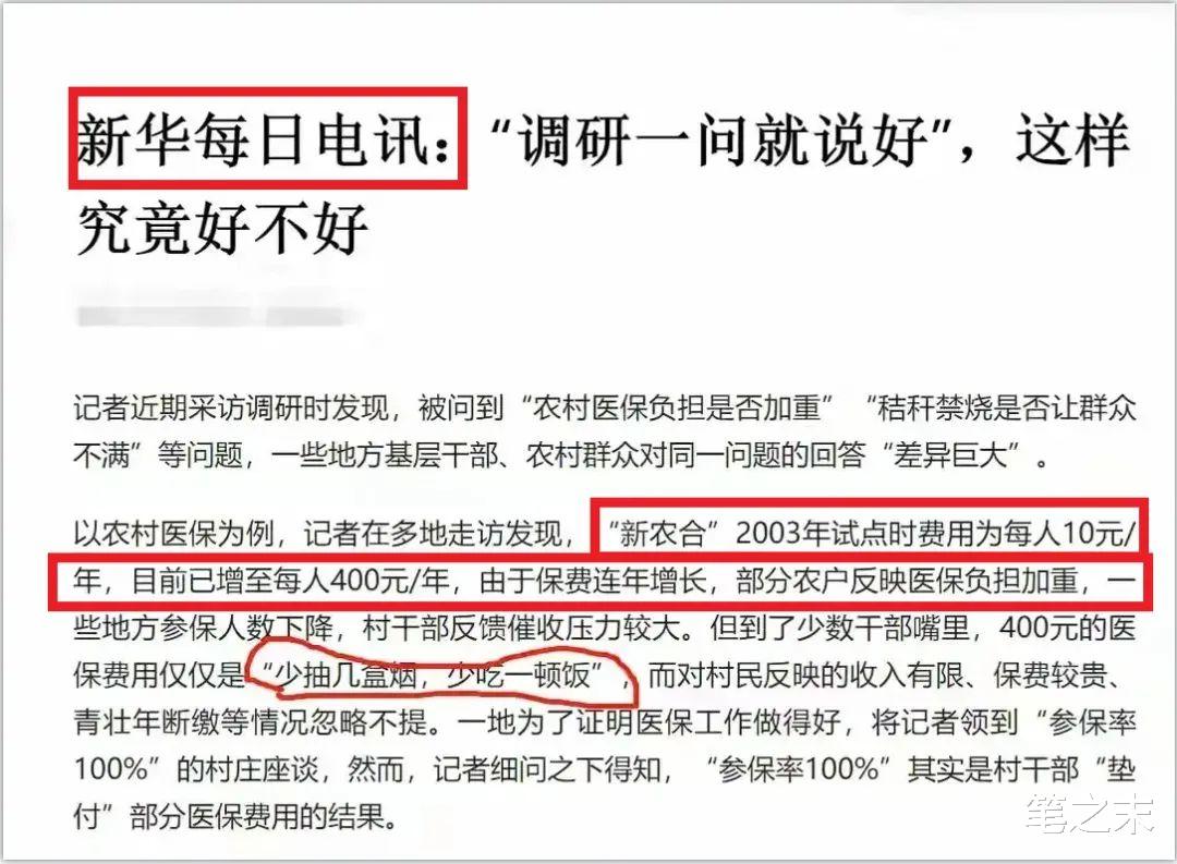 刘大爷介绍说,今年不交新农合的,农民占大多数!所以,很多村干部头上的压力都很大,没有办法,农民嫌400块钱太贵。据国家医保局公布的数据显示,城乡居民医保的参保人数从2019年开始逐渐下降。曾有数据显示,2022年城乡居民医保参保人数较上年下降2517万人。2500万!多么庞大的一个数字,为什么大家不愿意交呢?本来,“新农合”是为农民设计的,目的是给农民减轻医疗负担,现在农民不买账,究竟为什么呢?央媒新华社披露:医疗保费涨价太快了!