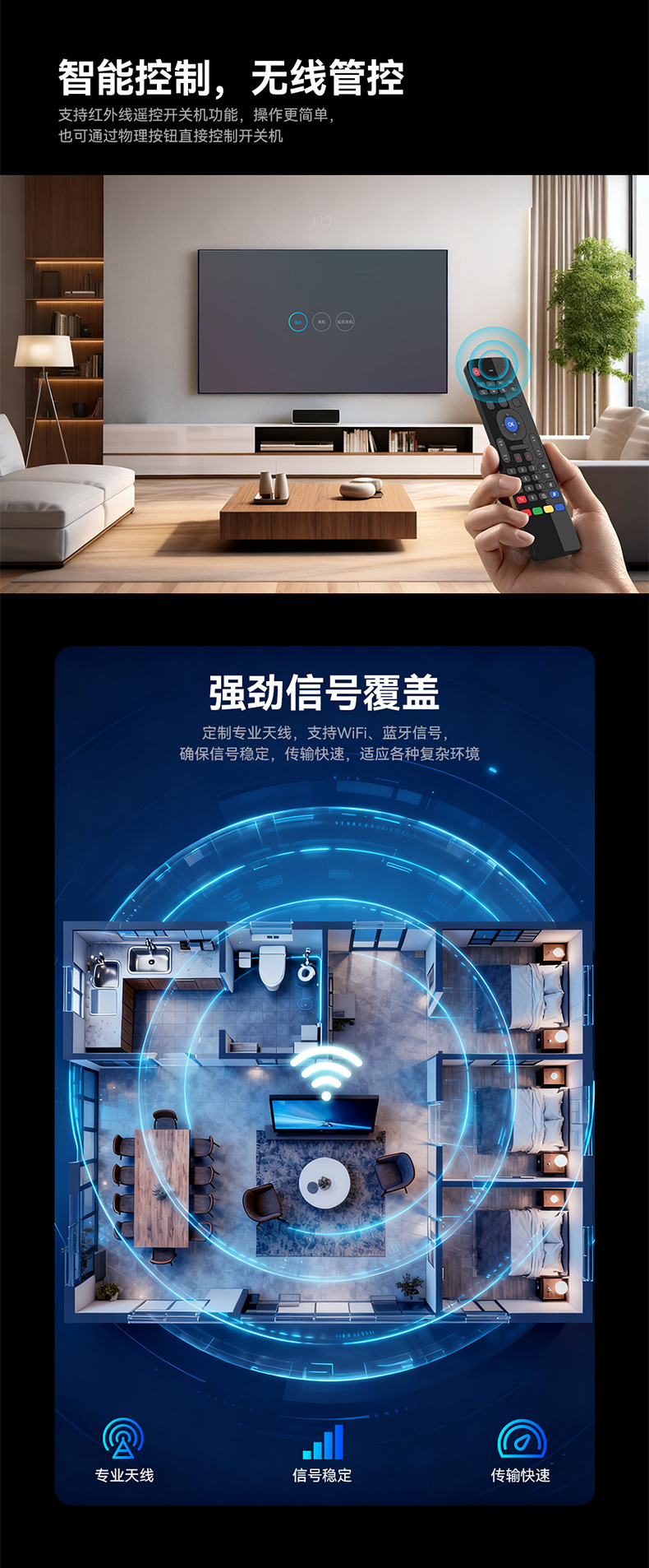 7. 智能红外控制: 支持红外遥控开关机,并可学习电视红外信号,实现设备联动(部分型号支持与电视同时开关机),操作便捷,带来“飞鼠”般的无线操控体验。
