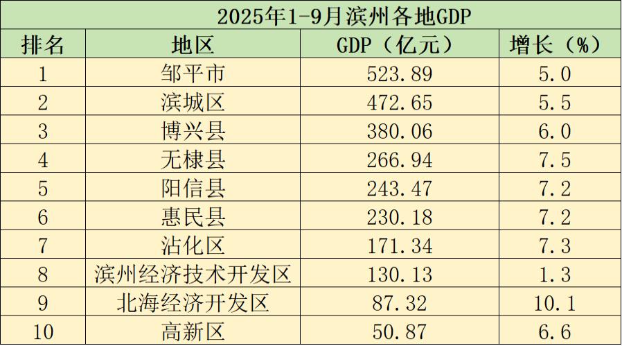 2025年前三季度滨州GDP为2556.84亿,增长6.0%。滨州的GDP表现较为稳定,总量在两千亿级别不断提升。现在我们一起来看滨州各地GDP表现。