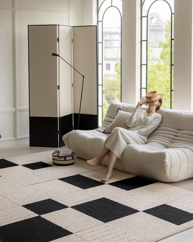 注意:地毯越大越好看,尽量让家具的前腿都放在地毯上,这样既能提升舒适度,又能营造松弛的氛围感。