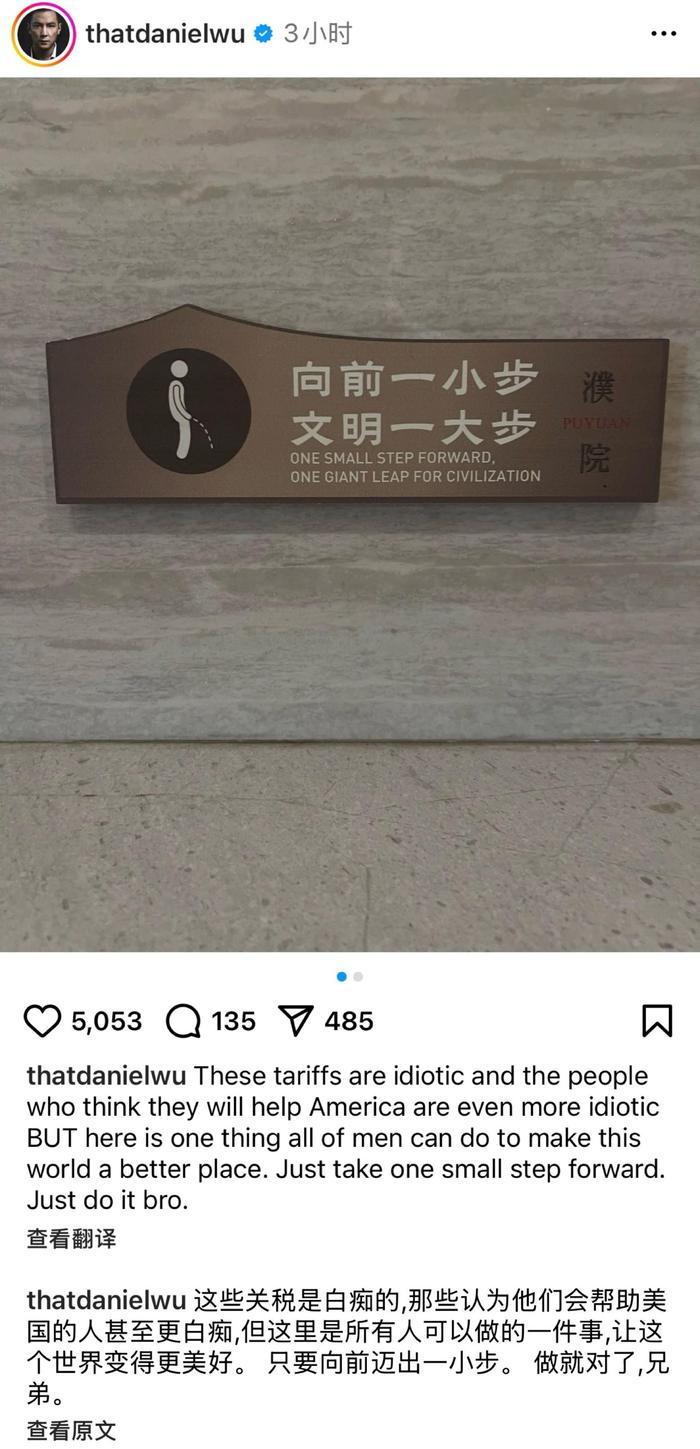 4 月 9 日,演员吴彦祖在社交媒体晒出一张公厕标语 "来也匆匆,去也冲冲",配文 "关税政策同理",意外引爆全网。这一 "神操作" 源于美国政府宣布对华商品加征 104% 关税,涉及从服装到汽车零部件的 5000 余种商品,连吴彦祖家的菜刀都因产自中国浙江永康而面临 "身价倍增" 的命运。