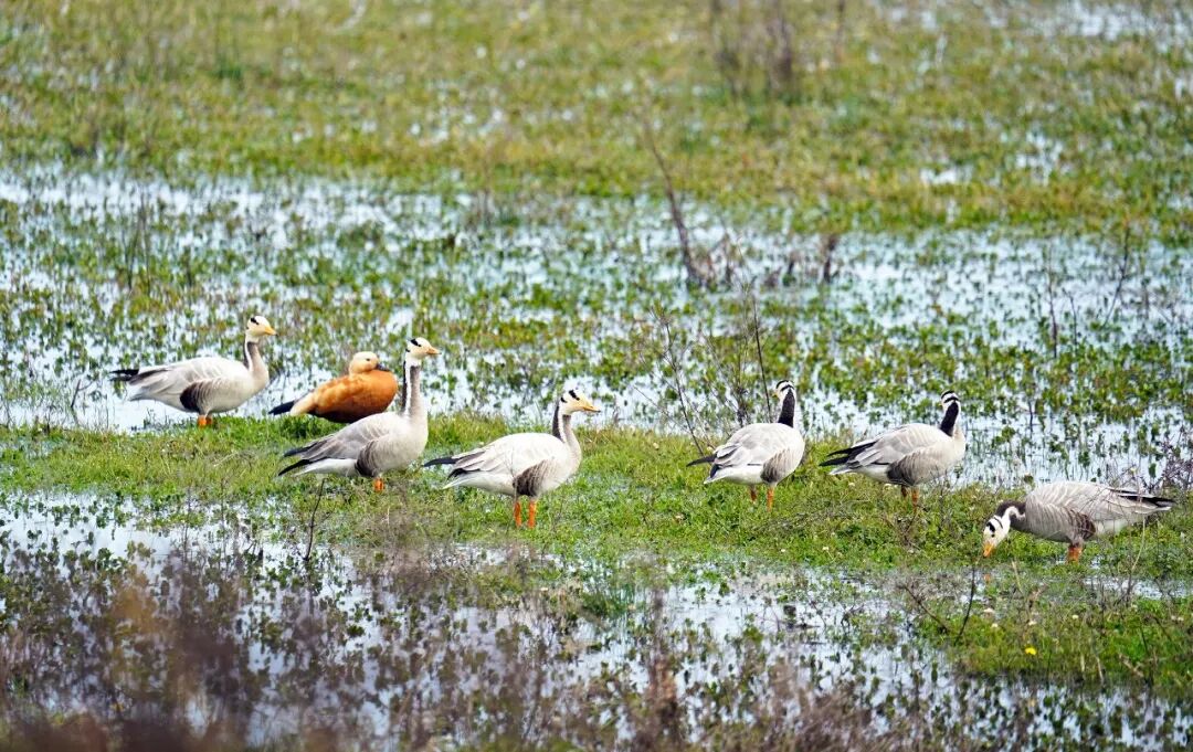 灰鹤129只、斑头雁200余、赤麻鸭400余只