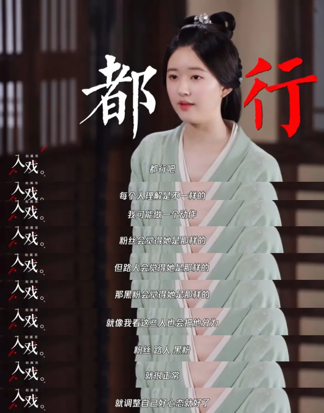 「每个人理解是不一样的。我可能做一个动作,粉丝会觉得她是那样的,但路人会觉得她是那样的,那黑粉会觉得她是那样的。就像我看这些人也会把他分为粉丝、路人、黑粉,就很正常,就调整自己好心态就好了。」