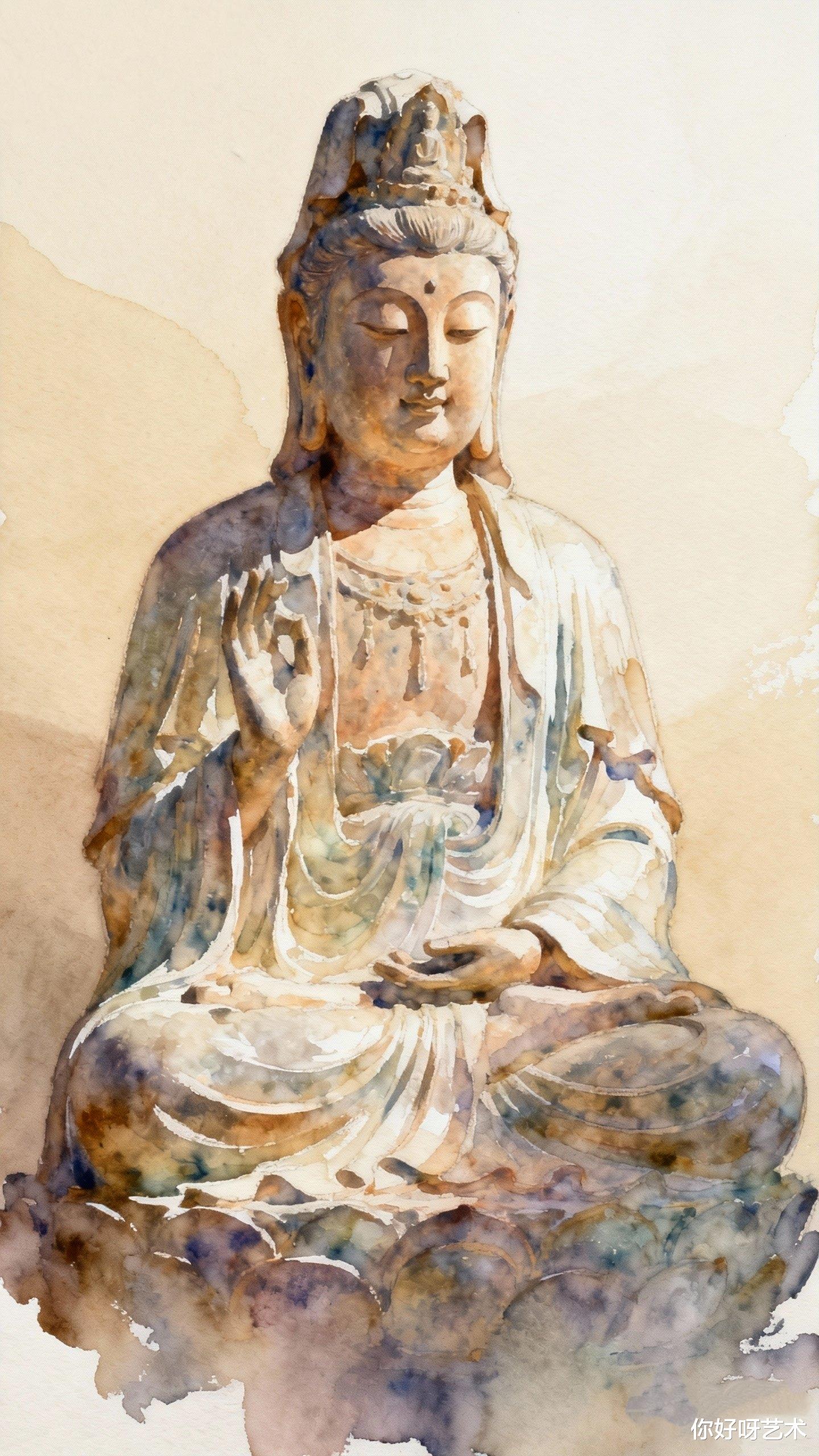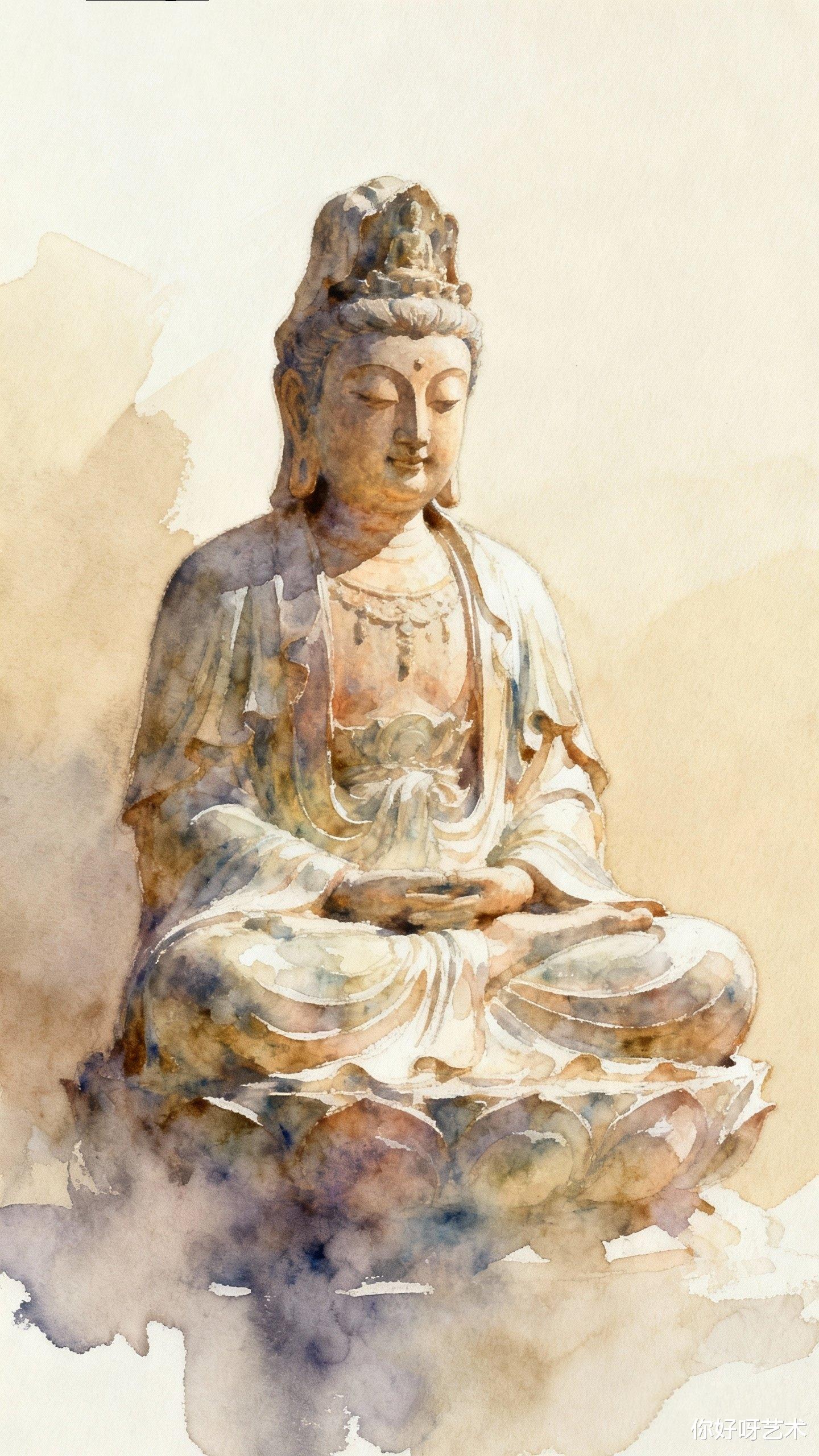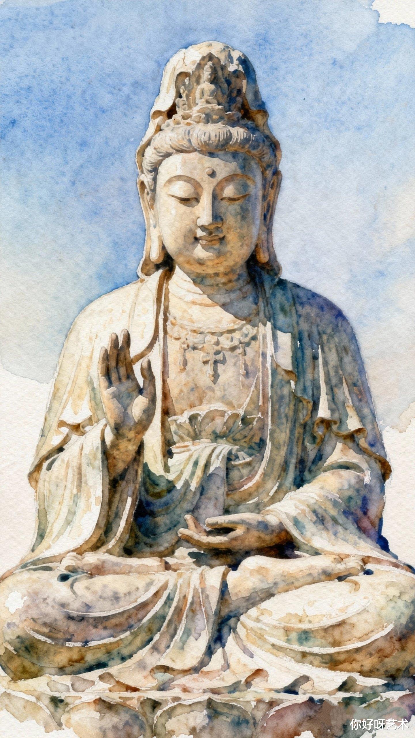 水彩佛像的绘制,恰似一场与时间的对话。我总在冬至前后执笔,因这日子的静默最宜供养神明。笔锋蘸饱了群青,在宣纸上勾勒出莲座的轮廓,每一笔都需屏息凝神,仿佛稍有不慎便会惊扰了佛前的香火。水彩的流动性让线条带着呼吸般的起伏,青蓝的底色渐次晕染,如同将天空的澄澈与湖水的深邃一并揉进了画中。