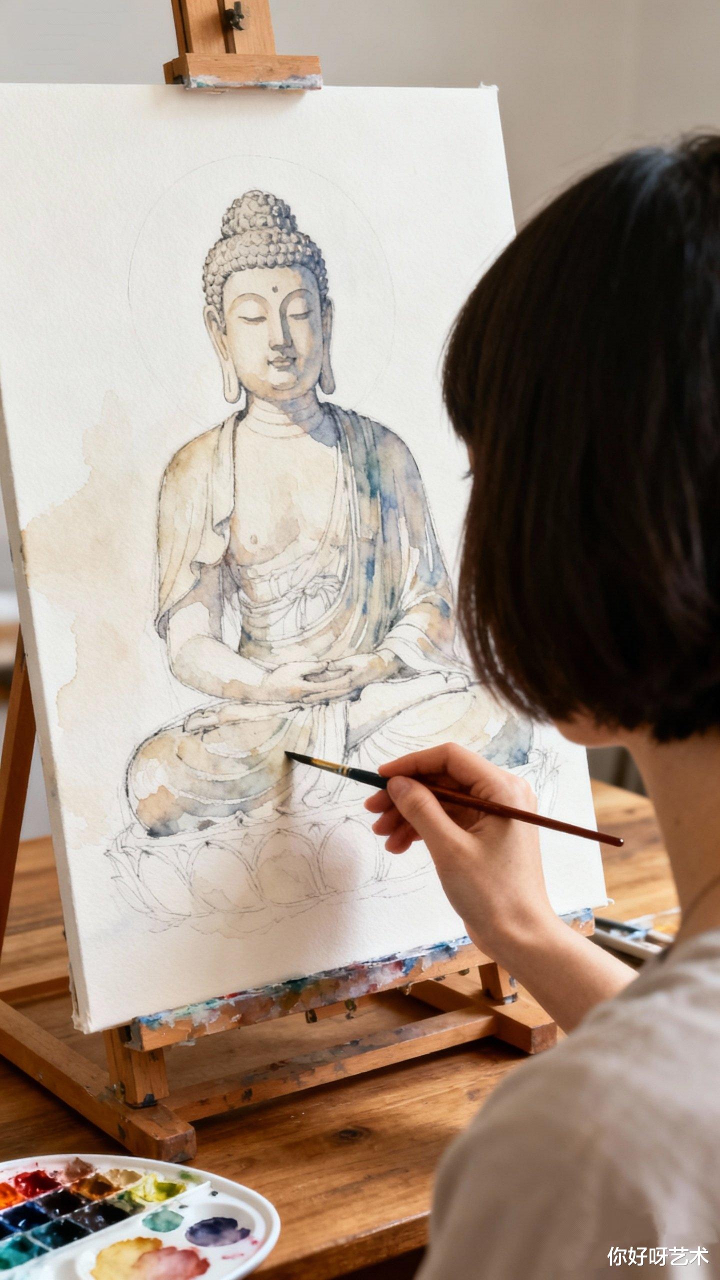 笔锋再次触纸时,我忽然明白,水彩佛像的绘制,实则是以色彩为经,以时间为纬,织就一幅心灵的袈裟。朱砂的炽热是初生之时的赤诚,赭石的沉静是历经沧桑后的豁达,而群青的深邃则是超脱尘世的空明。每一笔都需带着敬畏,如同在雪地上行走,稍有不慎便会留下难以抹去的痕迹。