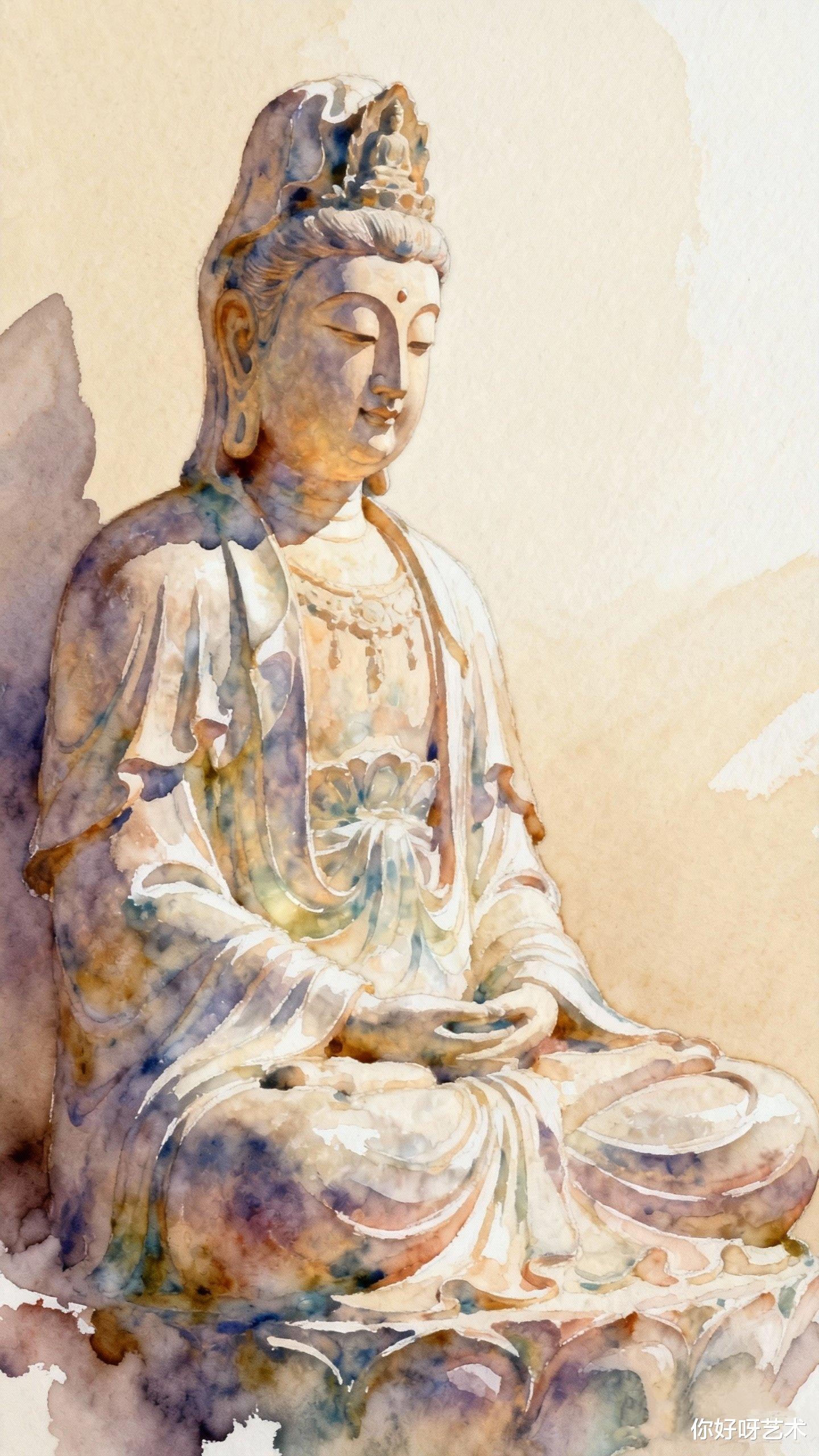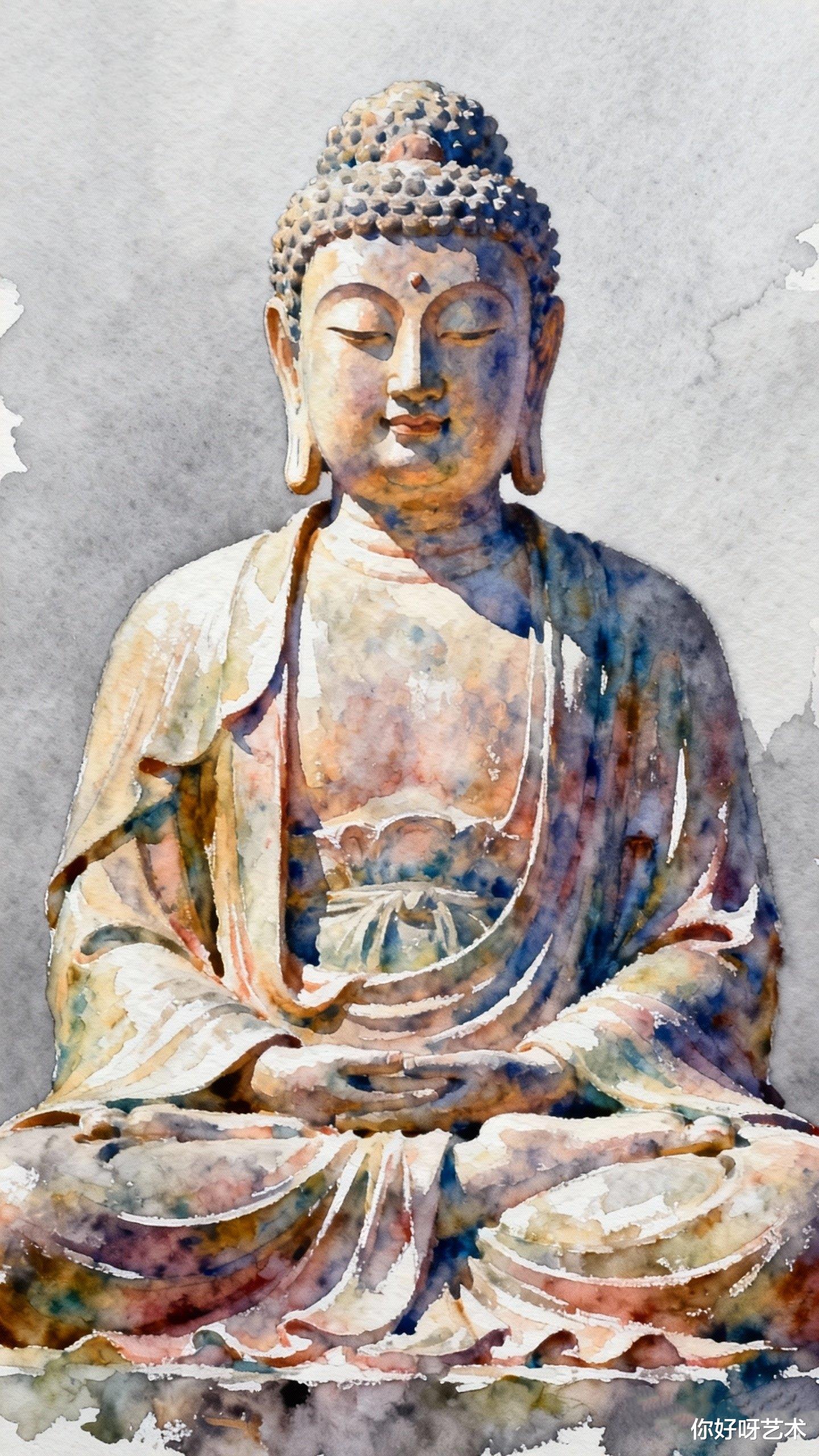 冬至的夜来得格外早。我点起一盏暖黄的灯,将画纸铺在案头。水彩在灯光下泛着珍珠般的光泽,佛像的轮廓在光影中渐渐清晰。我忽然想起《法华经》中的偈语:“若人散乱心,入于塔庙中,一称南无佛,皆共成佛道。”或许这画中的佛像,本就是一颗散乱心在尘世中的投影。水彩的流动与凝固,恰似人生的起落与聚散,而佛的慈悲,则是在这无常中寻得的一份恒常。
