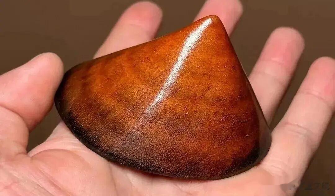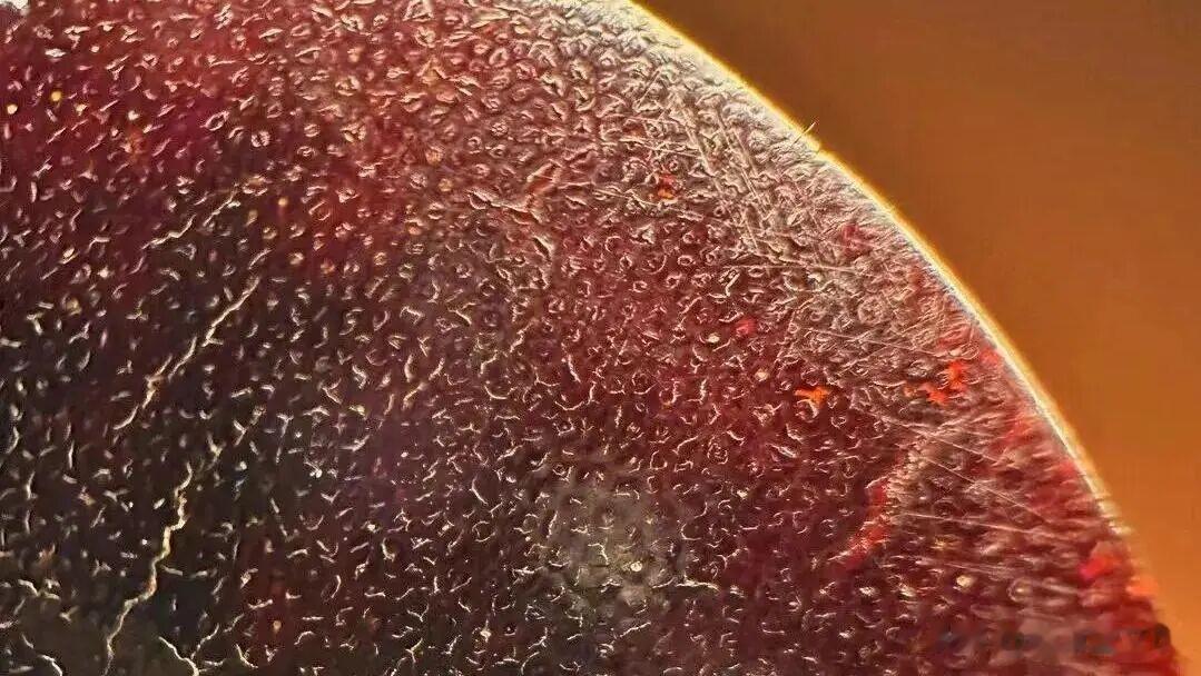 罕见的老料犀角尖,通体呈酒红色,有点像火焰山,还有一圈圈独特的火环。底部角裙边角质颜色比较黑。翻开看底部的鱼子纹,颗颗清晰可见。