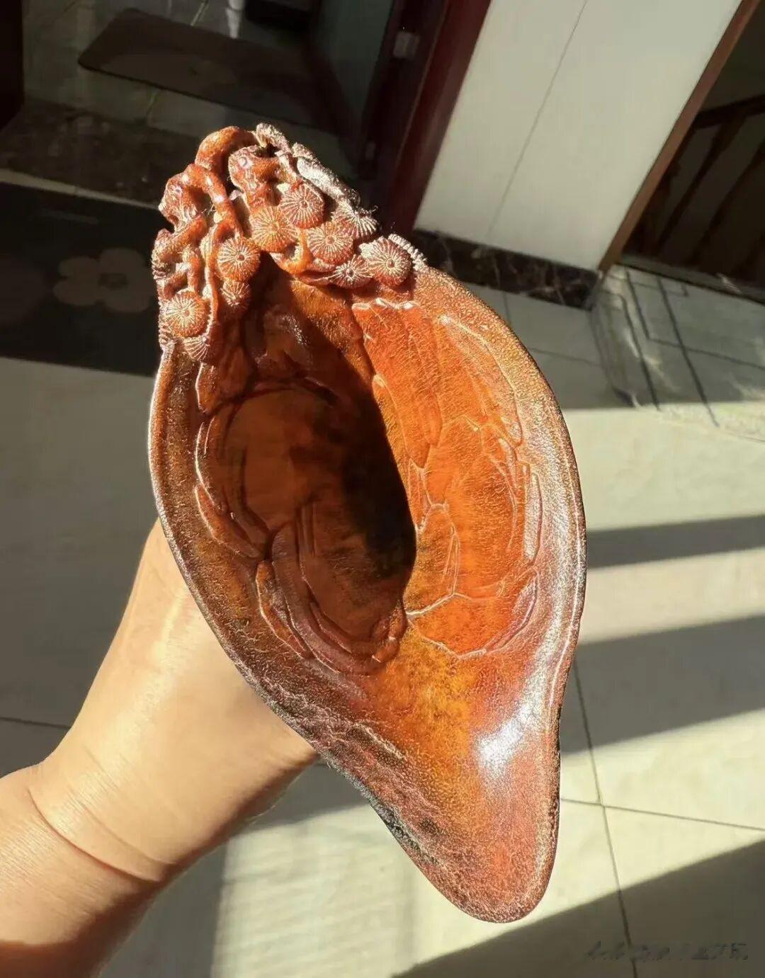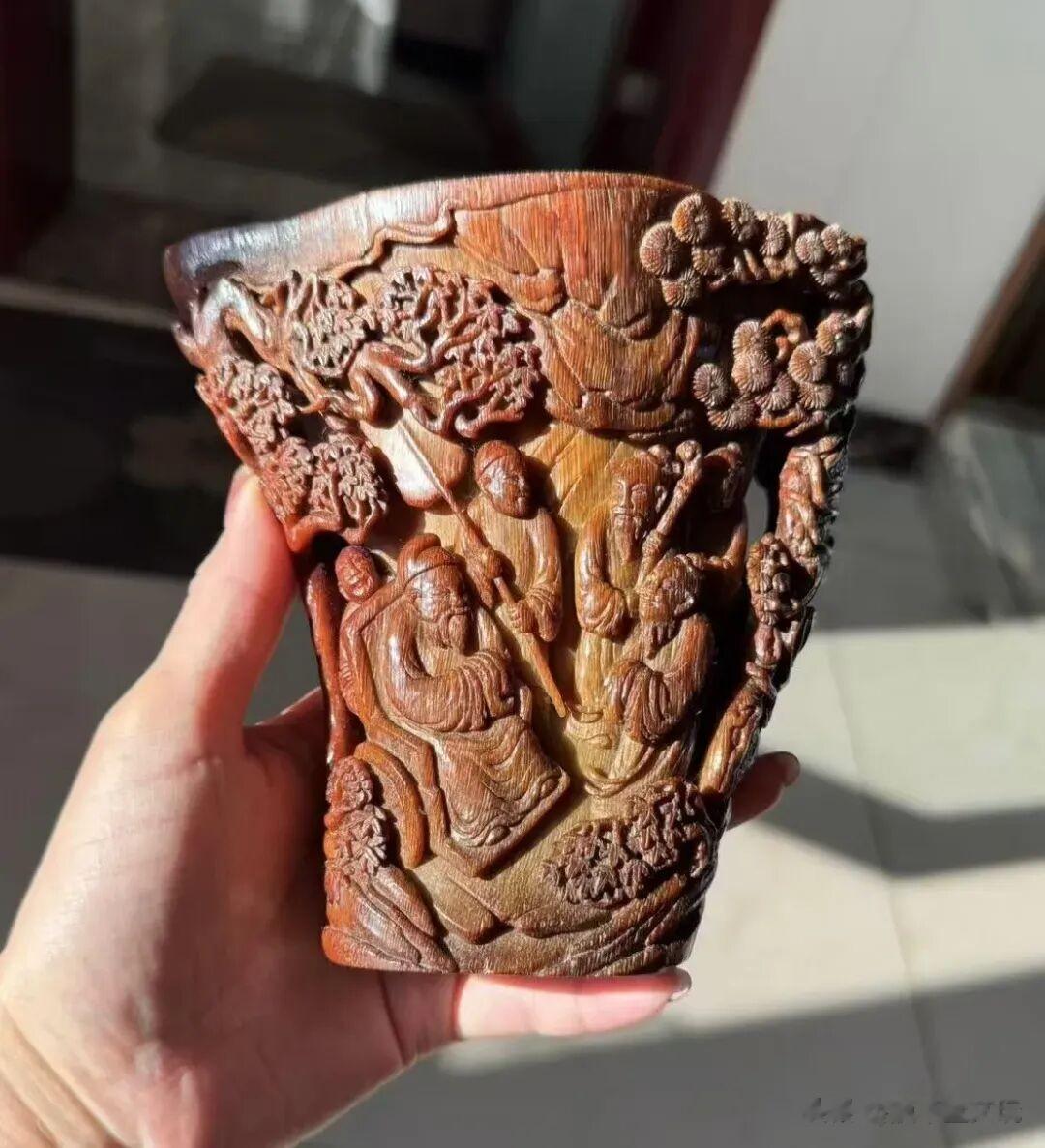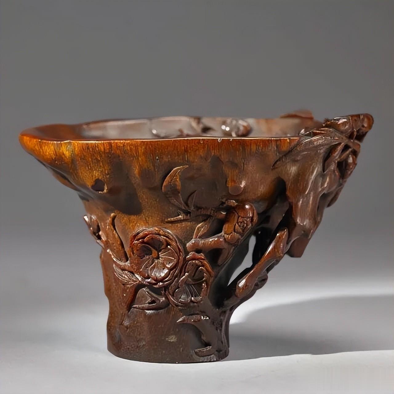 到了清代,匠人们在雕刻前会做一些加固工艺,比如刷一些植物胶,冷凝后再雕刻,雕刻好加热融化,算是突破了这个雕刻难题,所以我们能看到清代的犀角雕样式更加丰富,雕工更精湛唯美。