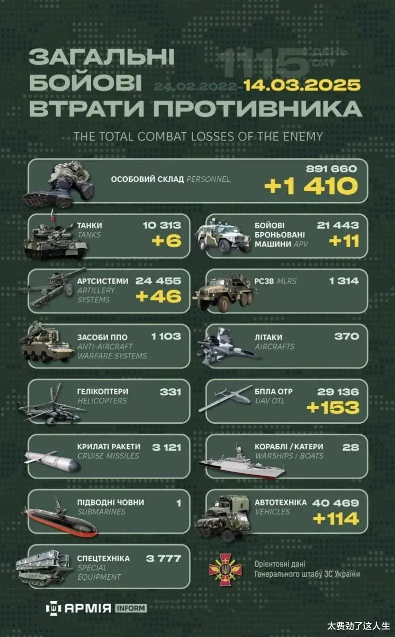 昨天一天,俄军单日伤亡1410人,伤亡人数即将突破90万。
