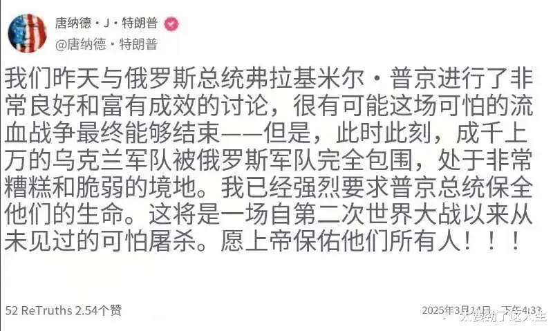 据报道,特朗普3月14日早些时候发文说,数千名乌克兰士兵正被俄罗斯军队“完全包围”,处境非常糟糕,“我强烈要求普京总统饶他们一命”。