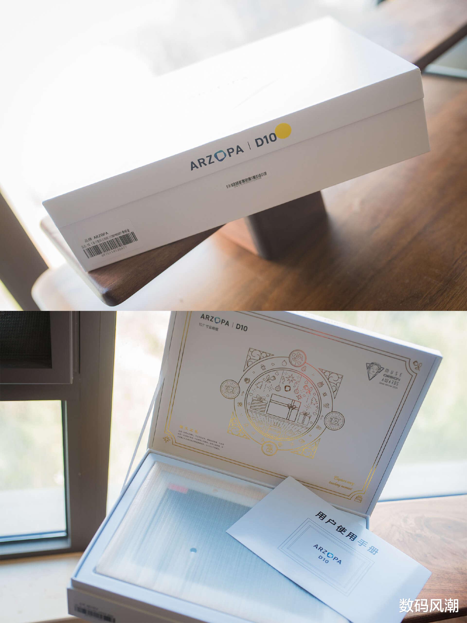 之前入手过ARZOPA阿卓帕的便携显示屏,所以对简单logo的包装盒并不陌生。但此次数码相框D10更礼盒式的开箱方式,一改直男风格,更具仪式感。
