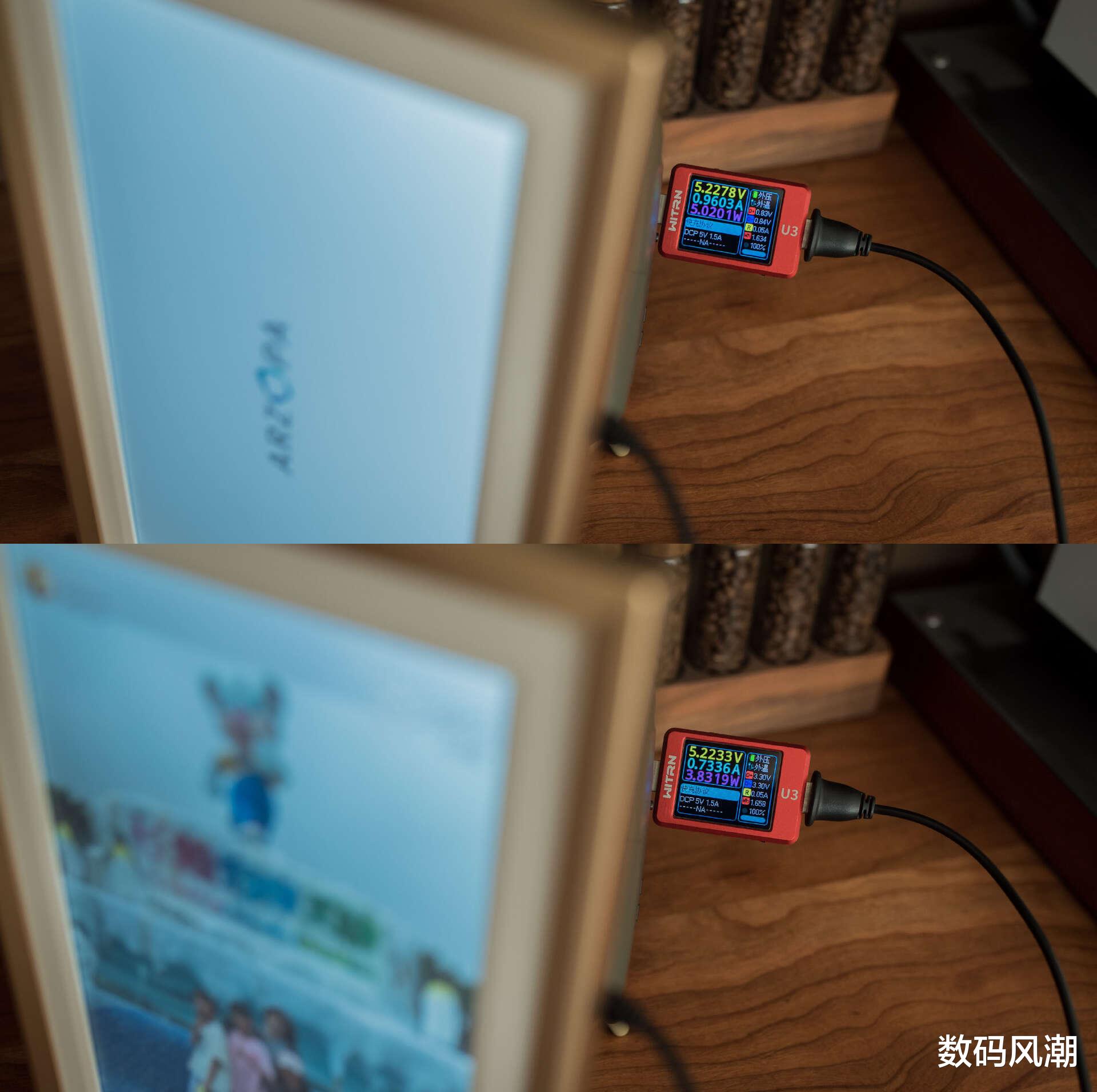 因为正好在测试其他设备,顺便就测试一下这款需要长期亮屏设备的功耗如何。虽然官方有提示需要USB-A转DC,但我实际测试确实可以直接使用充电宝供电。因为其整体标称也只有5V2A,实际工作状态下(默认80%亮度)也就在5W以内,可以说供电需求远比我想象中要小太多了。当然APP内还有睡眠模式,可以进一步降低功耗且保护屏幕。