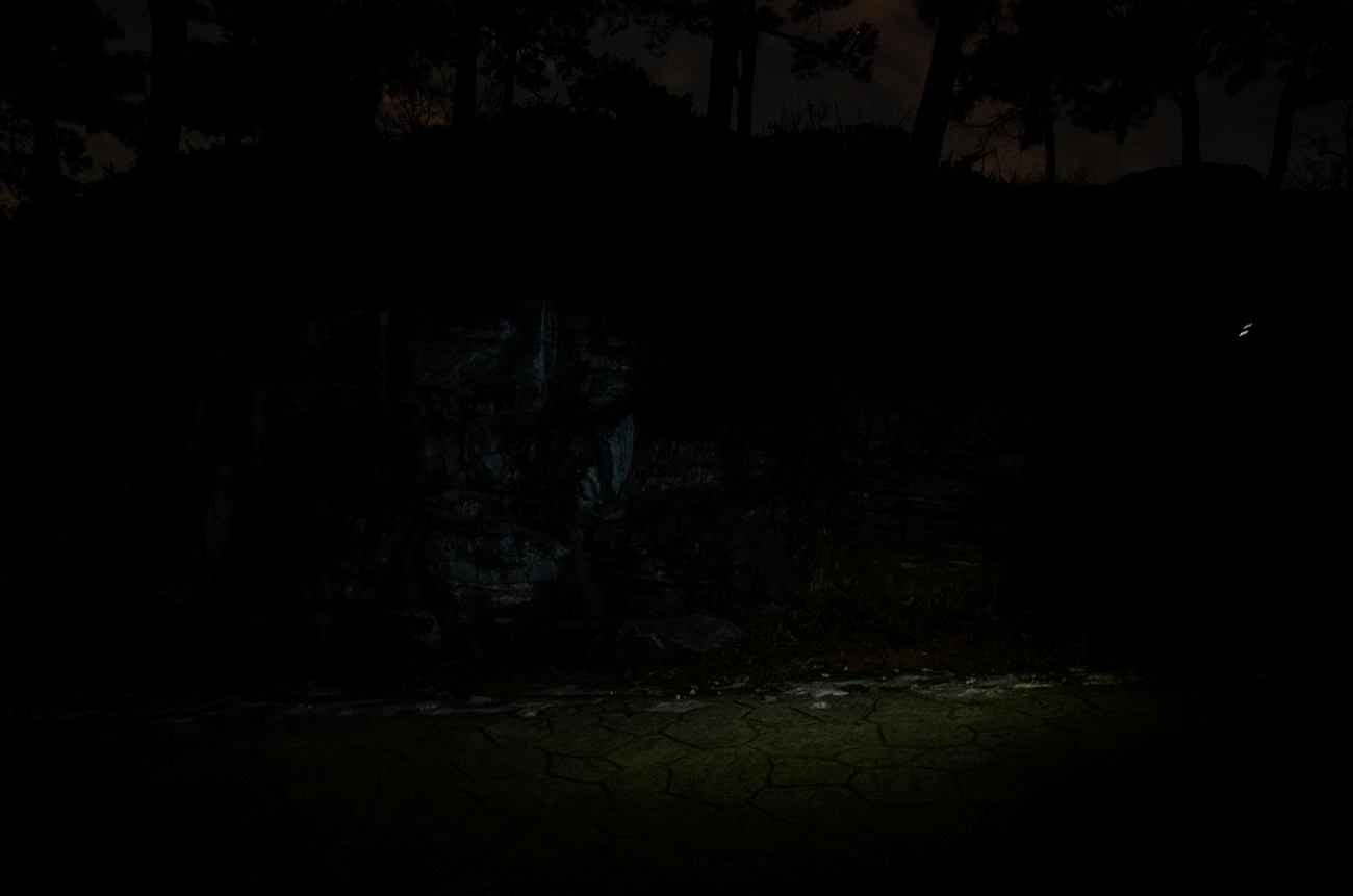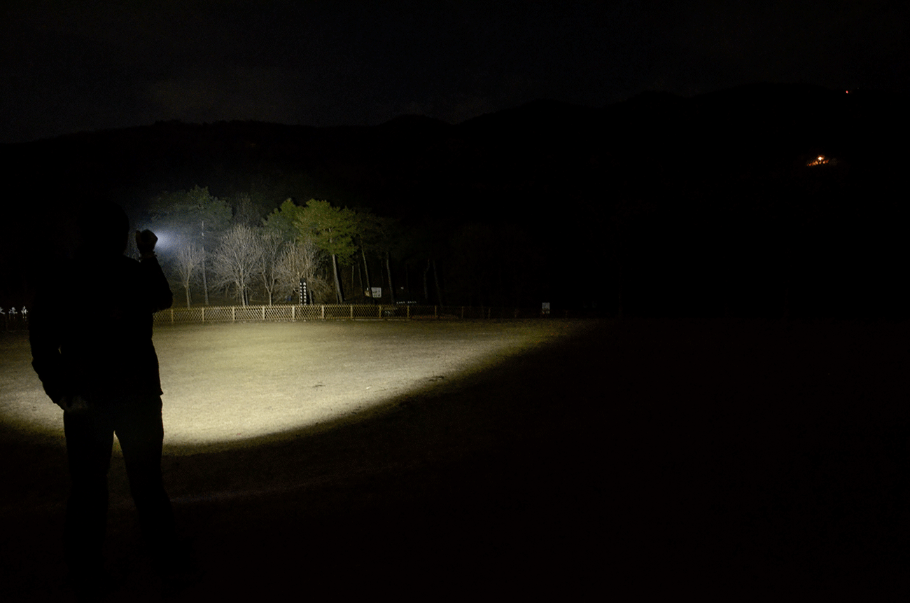 在户外,就需要150lm的高档位,大面积泛光照明,可以将使用者脚前至20米开外的环境全部照亮,正常活动,效果很好,补光照明,均匀通透。