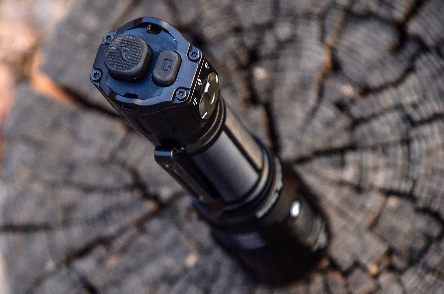 尾部是开关按键,双键胶帽设计,一大一小、一圆一方、一高一矮、一正一斜,手感区分度高,大的是主开关、战术开关,负责开关机;小的是副开关、功能开关,负责调整变化,分工明确。