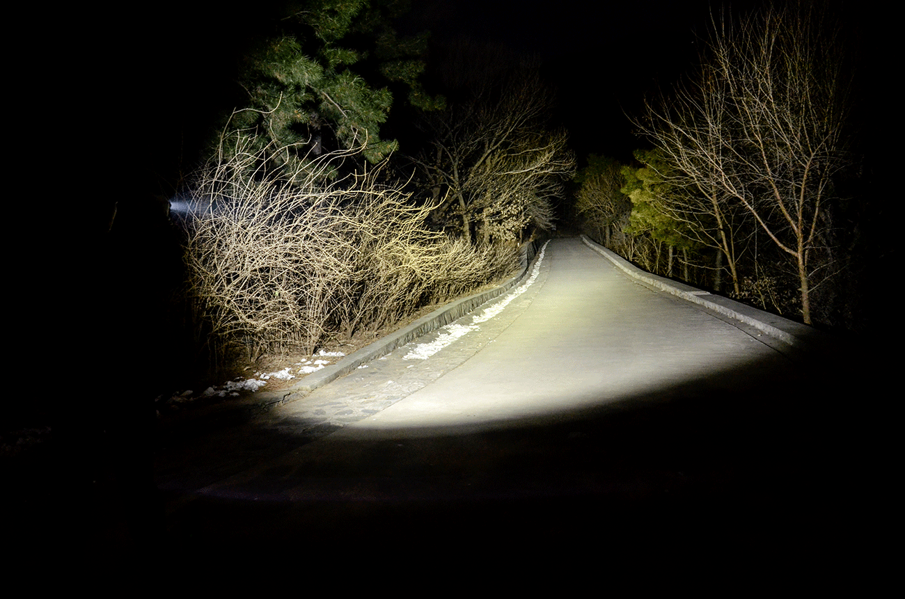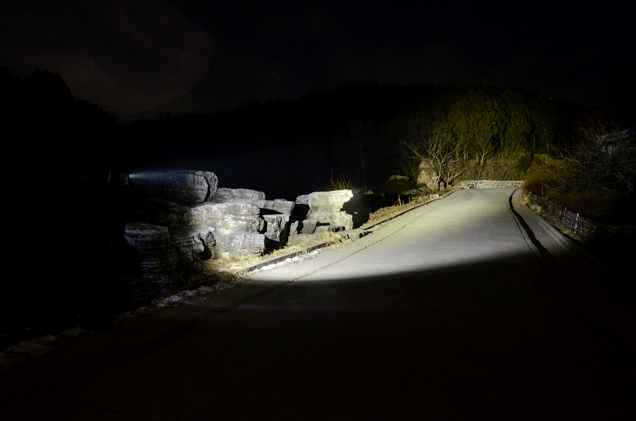 先来看远射效果,最大光通量3600lm下的中心光强达到2.8万CD,光线指向清晰精准,中心亮度集中,前后表现连贯,有效照明距离能够达到350米,视觉清晰。