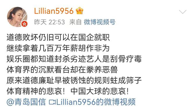 她还说,她的老公道德败坏,国企上班,年薪百万,胡作非为,娱乐圈都知道封杀劣迹艺人,但是体育圈一直沉默,认为这是体育精神的悲哀。