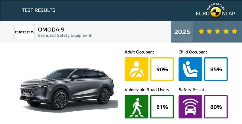 近日,欧洲ENCAP(欧洲新车安全评鉴协会)公布7月最新最新一批测试成绩,中国高端品牌星途旗下的混动SUV瑶光C-DM(欧洲市场商品名OMODA 9)获得五星安全评级。ENCAP测试涵盖了成人乘员保护、儿童乘员保护、弱势道路使用者保护及安全辅助四大项测评,瑶光C-DM分别获得90%、85%、81%、80%高分,全面展示了全球领先的安全性能。