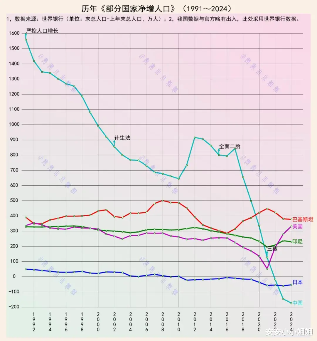 然而,观察这张1991年至2024年部分国家净增人口图,我们可以清晰地看到,美国人口从2.5亿到3.4亿的增长,并非一蹴而就,而是一个持续了三十多年的、有迹可循的动态积累过程。