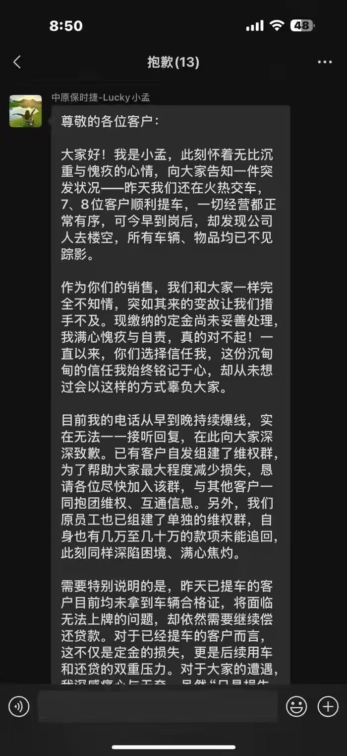 他在信中提到,直到12月22日,门店仍处于正常经营状态,当天还有7至8位客户完成新车交付,未显现明显异常。