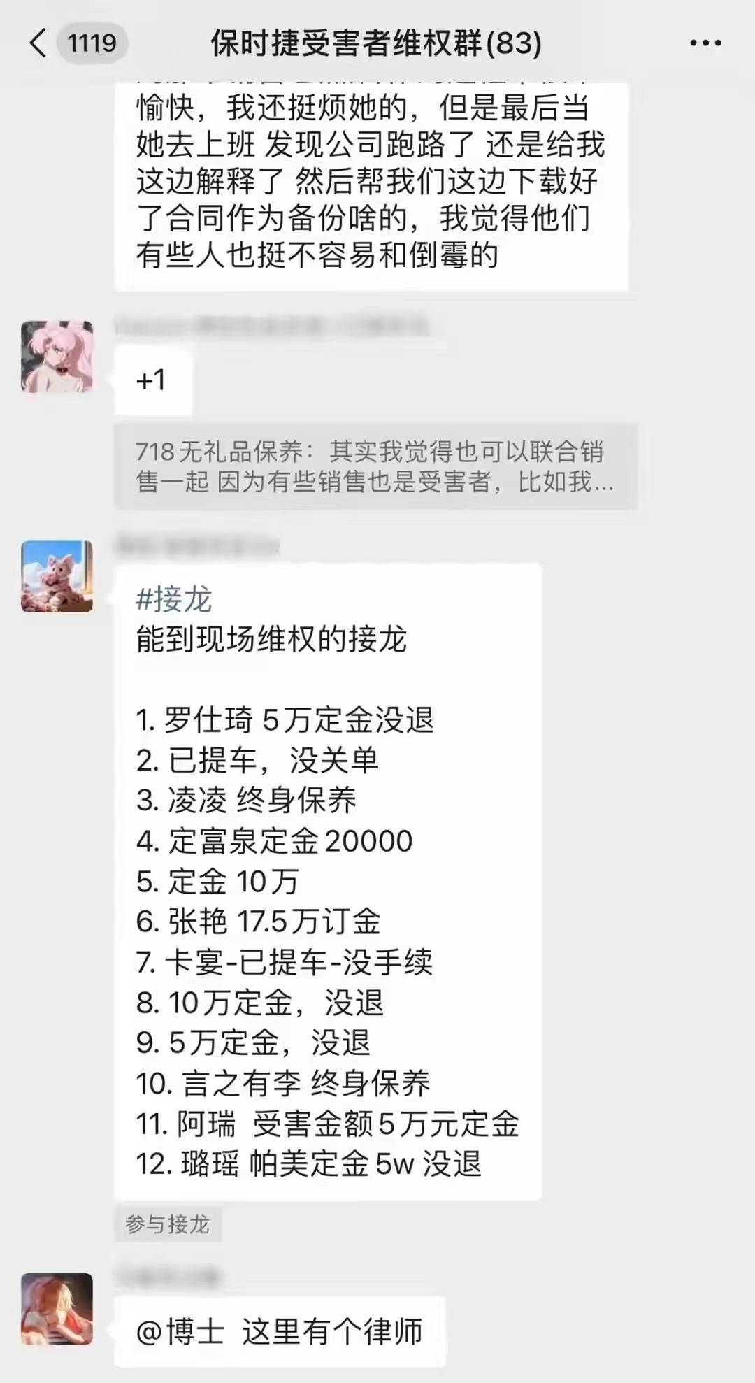 目前,维权的消费者大约有80多人,而且还在增加中,他们建立了一个“保时捷受害者维权群”,从公开的维权信息中发现,有的是后续保养、有的是交了定金未退、还有已经提车但没有关单,大家情况各不相同。
