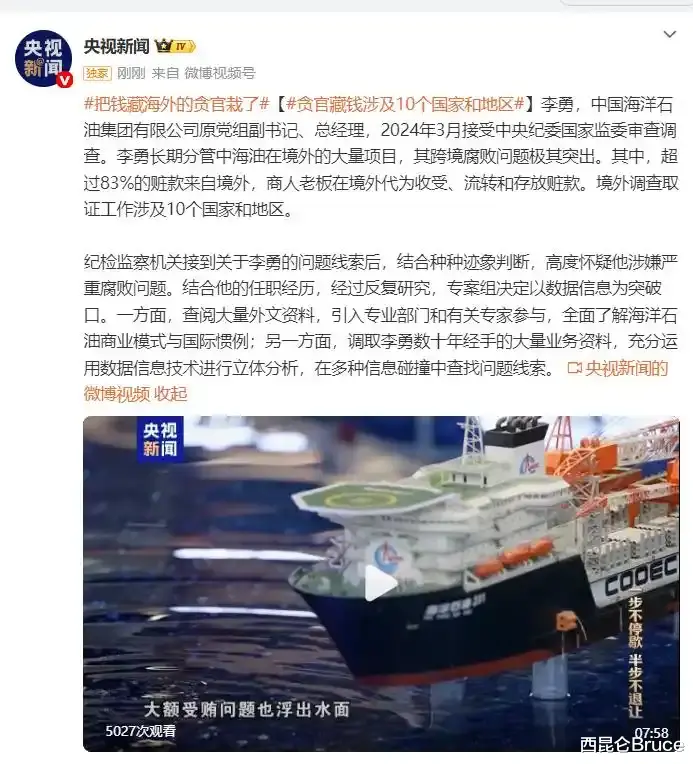 这是中国海洋石油集团有限公司原党组副书记、总经理李勇在镜头前的忏悔。这位在石油系统工作近40年的高管,曾利用自己对国际海洋石油商业模式的深度了解,将超过83%的受贿赃款隐藏在境外,涉及10个国家和地区。