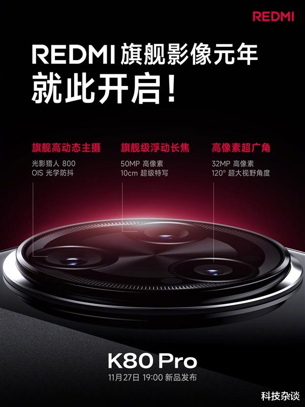 实际上K80系列性、屏幕等提升巨大在意料之中,谁也没有想到现在王腾也开始卷影像了。现在REDMI K80 Pro的三摄已经确认,主摄是光影猎人800,长焦是小米15同款,另外还有一个3200万超清超广角。这就有点猛了,因此网友戏称K80 Pro是小米15 Plus。