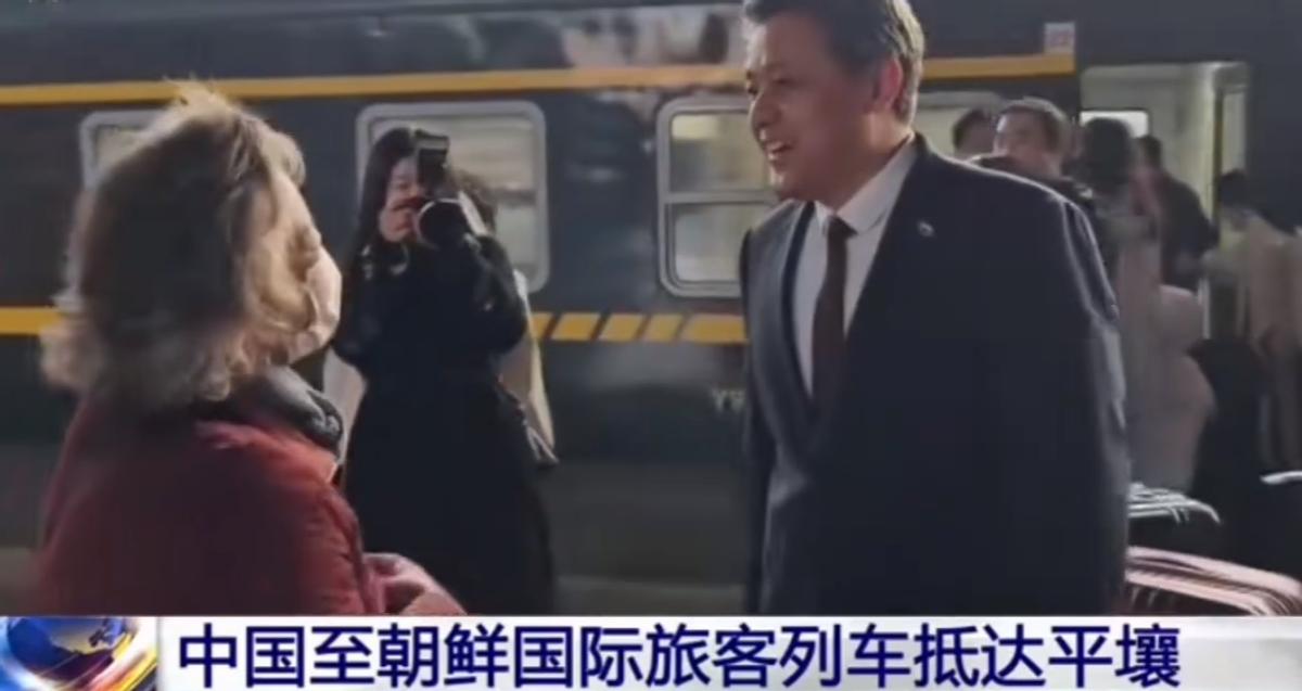3月12日下午,随着绿皮列车缓缓驶进平壤火车站,这趟中国到朝鲜的国际班列在中断6年后,终于恢复了运行。在平壤车站,中国驻朝鲜大使王亚军等使馆官员欢迎首班乘客。