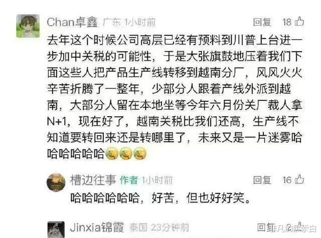 不少搞外贸的,还有那些在东南亚搞中转贸易的,甚至已经把工厂挪到越南的朋友们,现在简直是憋屈得不行。他们原本以为这样能捞到不少好处,结果现在却陷入了困境。那些把心血都投在越南厂子上的人,现在真是有苦说不出,眼泪都得往肚子里咽。