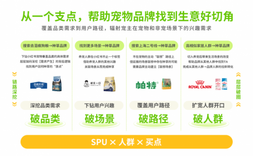 面对用户决策和消费趋势变化,小红书基于「SPUX人群X买点」精细化种草策略,聚焦人宠生活现场提出增长破局新思路:破品类、破场景、破路径、破人群。从品类需求到用户路径,辐射养宠人群在宠物和非宠场景下的兴趣需求,进行层层渗透,帮助品牌实现生意破圈增长。