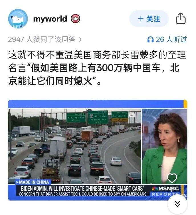 此时,不得不重温美国商务部长雷蒙多的至理名言“假如美国路上有300万辆中国车,北京能让它们同时熄火”,人家美国为什么这么栽赃中国?