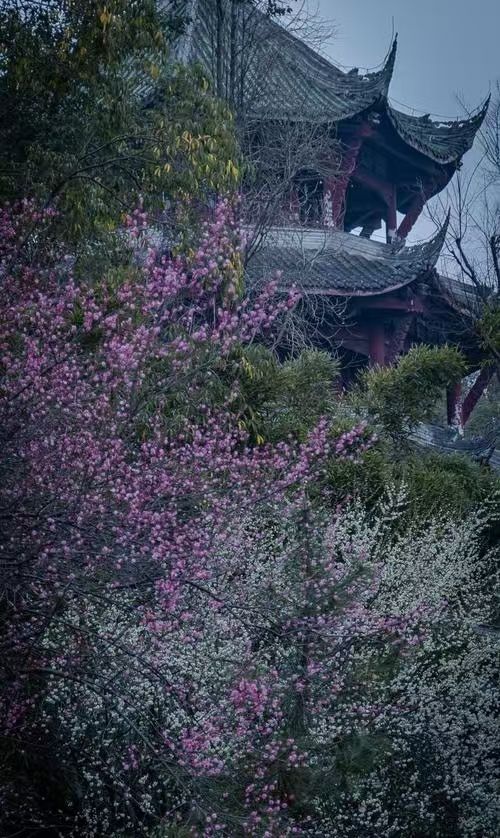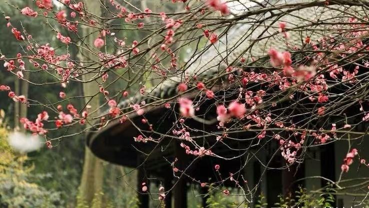 当冬日的寒风依旧在城市中肆虐,成都杜甫草堂内却已悄然绽放出一抹春色——红梅傲立枝头,如同大自然的信使,提前预告着春天的脚步。它们不畏严寒,傲然绽放,为这座历史悠久的古建园林披上了一层生机盎然的纱衣。