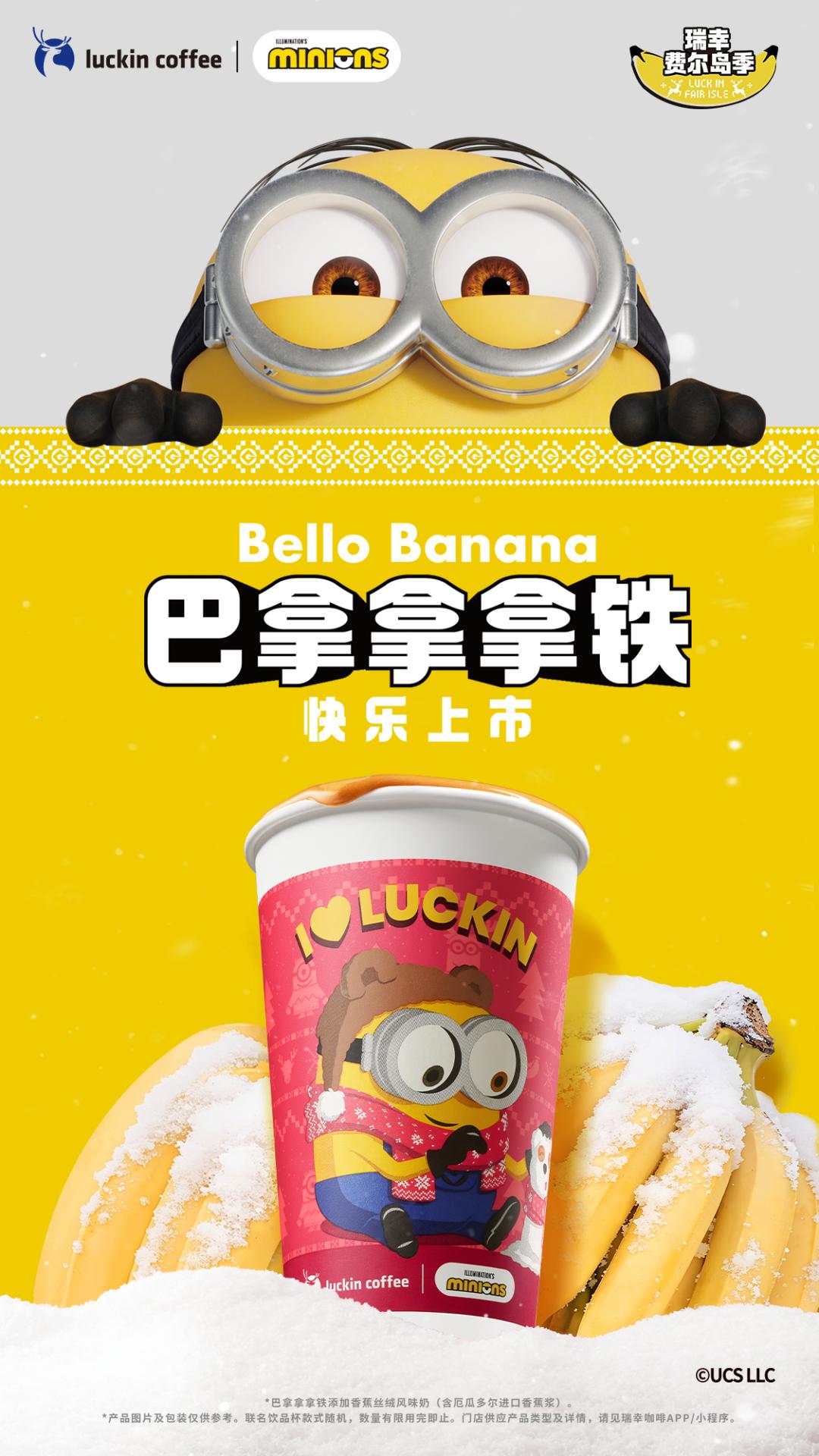 瑞幸年度最「吵」联名来了12 月 15 日,瑞幸正式与全球爆火的「小黄人」开启联名,双方以小黄人最爱的香蕉为灵感推出新品「巴拿拿拿铁」「香蕉丝绒撞奶」以及「巴拿拿大福」,带来软萌与咖香编织的温暖。