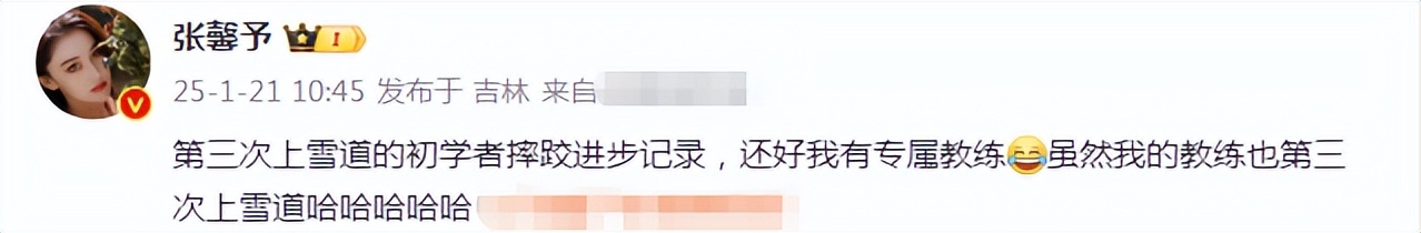1月21日上午,37岁“军嫂”张馨予在社交网贴出一则滑雪vlog记录视频,并附文称:“第三次上雪道的初学者——摔跤进步记录,还好我有专属的教练(老公何捷),虽然我的教练也才是第三次上雪道,哈哈哈哈”!
