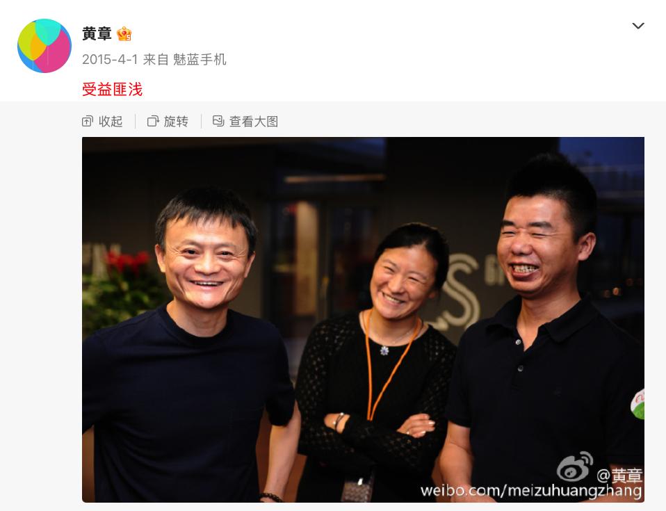 这一年的愚人节,马云在杭州的阿里总部接待了他刚刚投资过的团队,黄章亲自带领一众魅族高管与马云进行了一次长谈。鲜少露面的黄章发布了一张合影,自称“受益匪浅”。