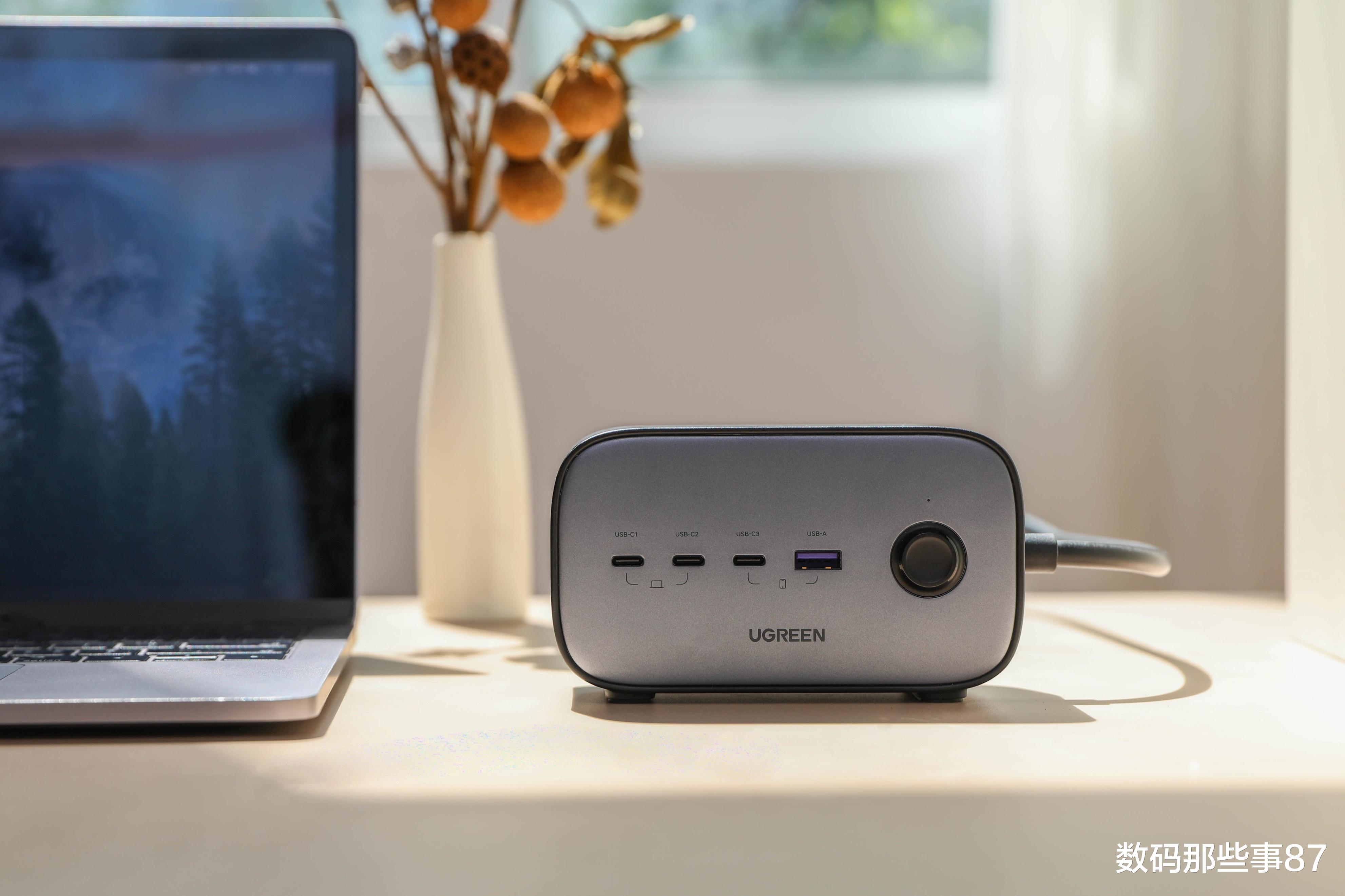 而绿联100W智充魔盒,前面的四个快充口可以直接给我的电脑、平板、手机、耳机一起充电,无需再反复拔插充电头,连上数据线就能充,直接一步到位。