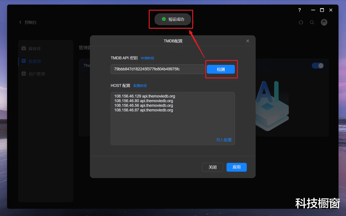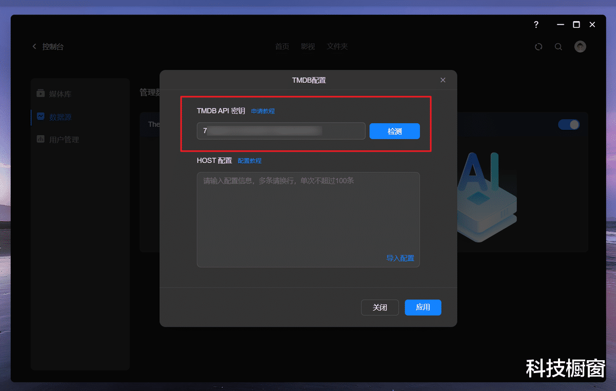 粘贴到绿联影视中心这边的TMDB API 密钥输入框中即可。后面有一个检测按钮,如果不出意外,估计很多用户都会验证失败,这是因为TMDB API DNS污染的问题,导致我们不能直接连通那边的数据源。不过解决起来也很简单,仅需配置下HOST即可。